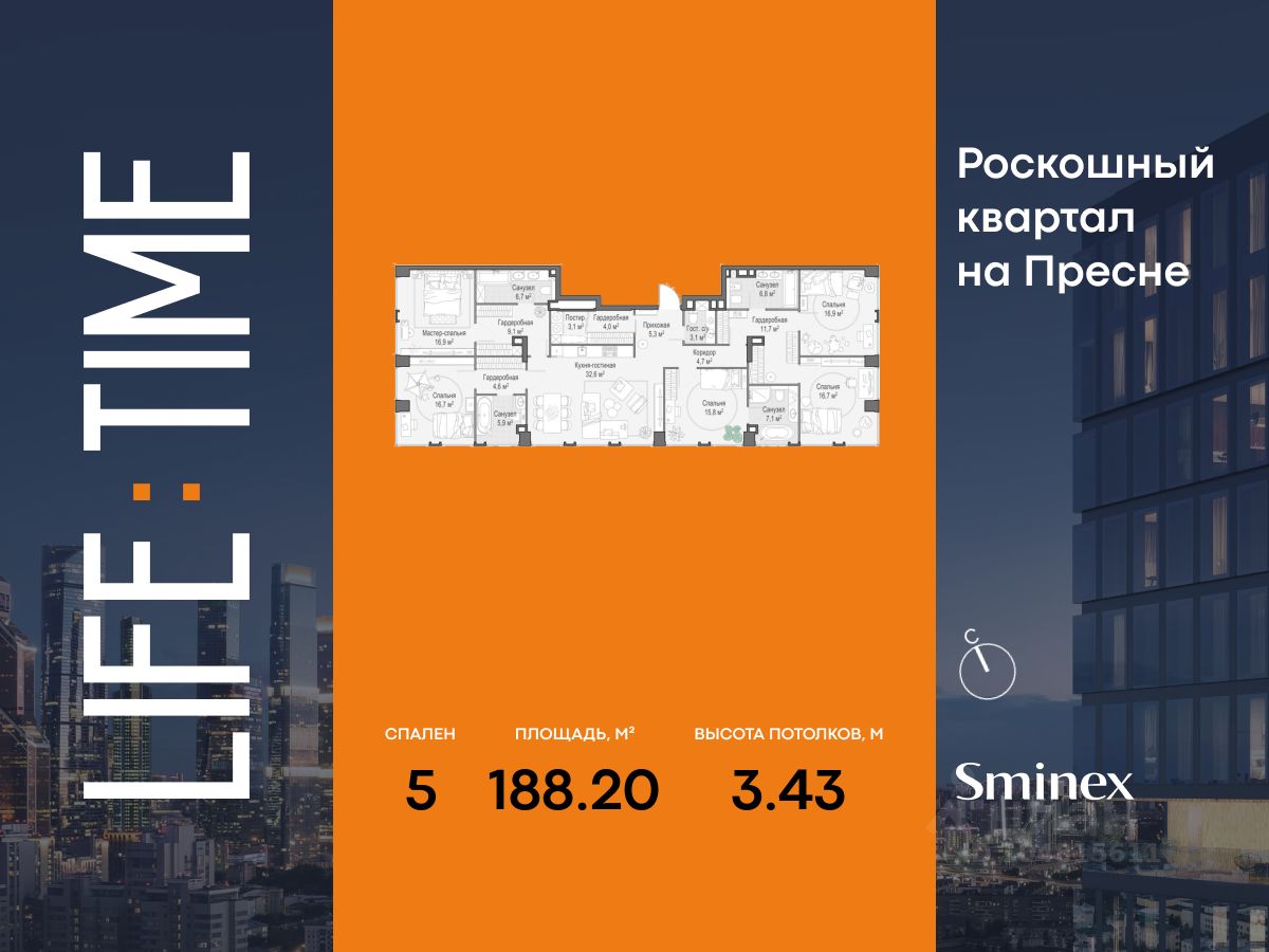 Просторная светлая квартира площадью 188,2 кв. м. Спальные комнаты и просторная кухня-гостиная (54,7 кв. м) отдалены друг от друга, окна выходят на разные стороны: северную, западную и восточную. Из квартиры открываются неповторимые виды на исторический центр столицы, парк ''Красногвардейские пруды'', а панорамное остекление улучшает видовые характеристики.