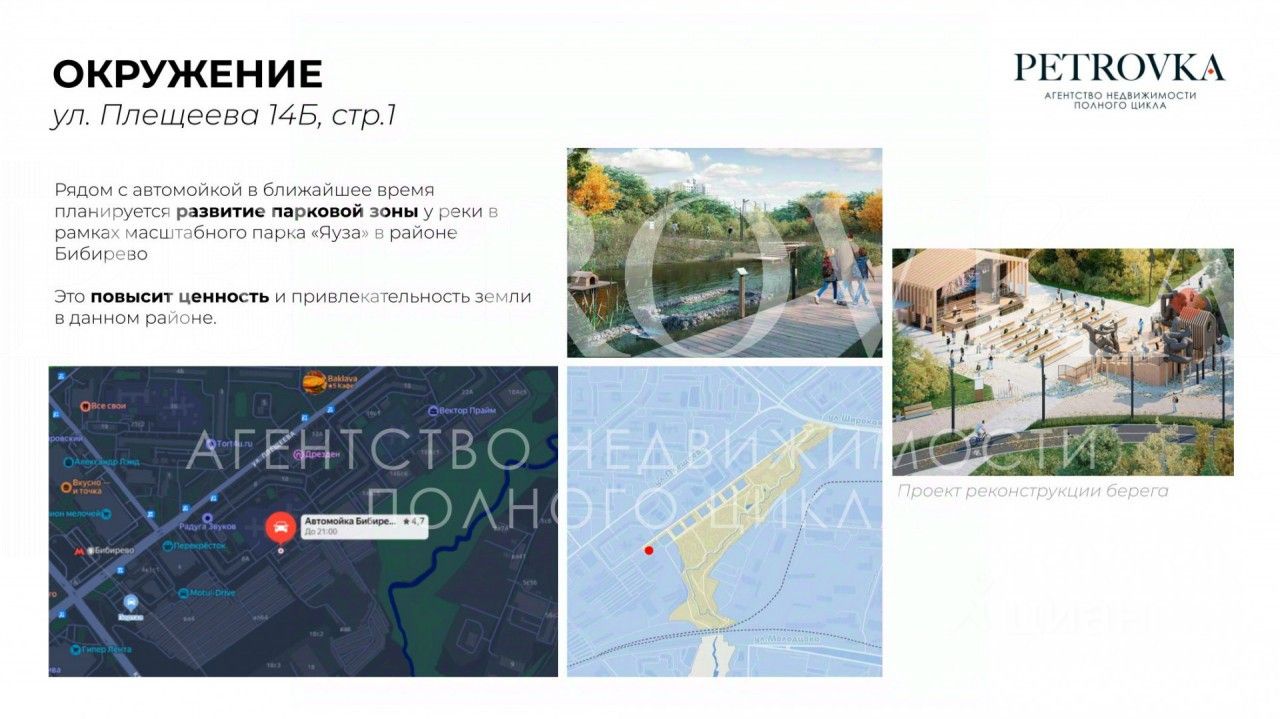 Рядом с автомойкой в ближайшее время планируется развитие парковой зоны у реки в рамках масштабного парка ''Яуза'' в районе Бибирево. Это повысит ценность и привлекательность земли