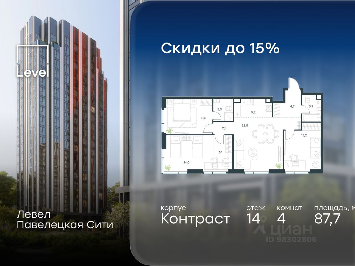 В Даниловском районе столицы (ЮАО) продаётся 4-комнатная квартира площадью 87.70 кв.м без отделки. Квартира расположена на 14 этаже 27-этажного корпуса 'Горизонт' в жилом комплексе бизнес-класса Левел Павелецкая Сити. Высота потолков 3.00м.