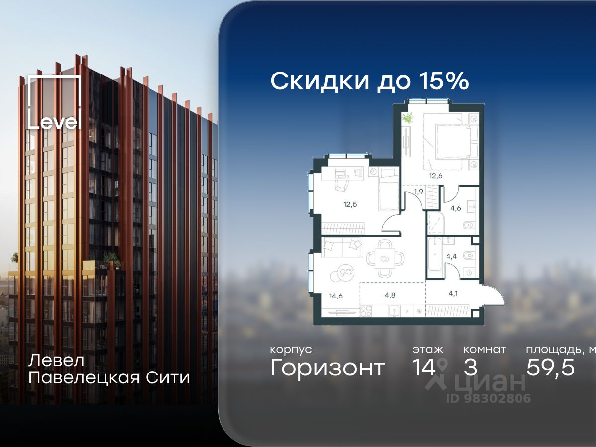 В Даниловском районе столицы (ЮАО) продаётся 3-комнатная квартира площадью 59.50 кв.м без отделки. Квартира расположена на 14 этаже 20-этажного корпуса 'Горизонт' в жилом комплексе бизнес-класса Левел Павелецкая Сити. Высота потолков 3.00м.