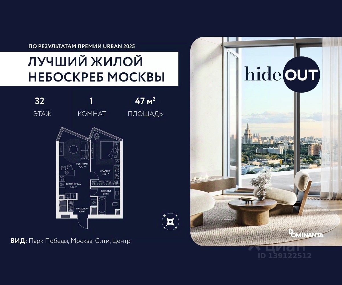 Прямая продажа от застройщика. Продается 2-комнатная квартира площадью 47 кв.м. на 3-м этаже 34-этажного дома в ЖК hideOUT с панорамными видами: Центр. Высота потолков 3,25 м. hideOUT — премиальный проект компании Dominanta. Это новый уровень жизни и комфорта без компромиссов. Две башни — 34 и 49 этажей — открывают захватывающие виды на Москву. Архитектурной доминантой проекта становится мост, соединяющий башни на высоте 80 метров. Закрытая территория, охрана 24/7, зона экстренной безопасности на подземном уровне, система пожаротушения. На мосту между башнями на 22-м этаже находится SocialHUB — предусмотрено 16 комфортных пространств для работы, отдыха и развлечений с панорамными видами и клубным форматом доступа. Концепция благоустройства hideOUT — баланс между природой и технологичным городом будущего. На территории сада предусмотрены 15 зон для отдыха, работы, спорта и детей. Знаковым местом станет центральная площадь с амфитеатром и водопадом — сочетание камней, растений и струящейся воды создает идеальный баланс с природой. В проекте действуют привлекательные условия покупки: - скидка до 20% при 100% оплате стоимости лота и ипотеке без субсидирования. Предложение действует до 28.02.2026. - рассрочка 0% на 12 месяцев с первоначальным взносом 30% / на 18 месяцев с первоначальным взносом 50%. Застройщик АО ''СЗ ''ХАЙДАУТ'', ИНН 7729058636, ОГРН 1027739319420. Проектная декларация на сайте наш.дом.рф. Предложение не является публичной офертой.