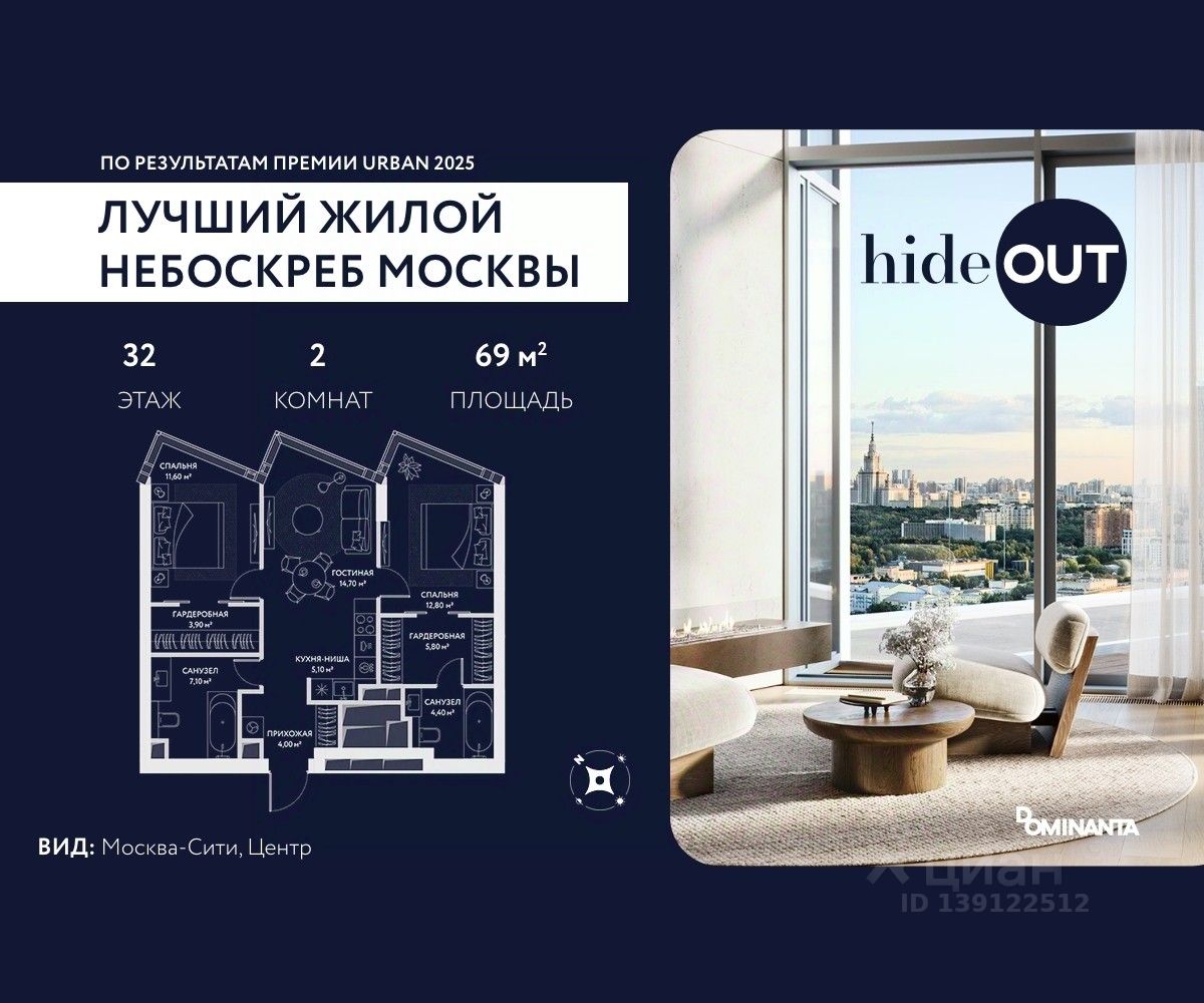 Прямая продажа от застройщика. Продается 3-комнатная квартира площадью 69 кв.м. на 4-м этаже 34-этажного дома в ЖК hideOUT с панорамными видами: Центр. Высота потолков 3,25 м. hideOUT — премиальный проект компании Dominanta. Это новый уровень жизни и комфорта без компромиссов. Две башни — 34 и 49 этажей — открывают захватывающие виды на Москву. Архитектурной доминантой проекта становится мост, соединяющий башни на высоте 80 метров. Закрытая территория, охрана 24/7, зона экстренной безопасности на подземном уровне, система пожаротушения. На мосту между башнями на 22-м этаже находится SocialHUB — предусмотрено 16 комфортных пространств для работы, отдыха и развлечений с панорамными видами и клубным форматом доступа.