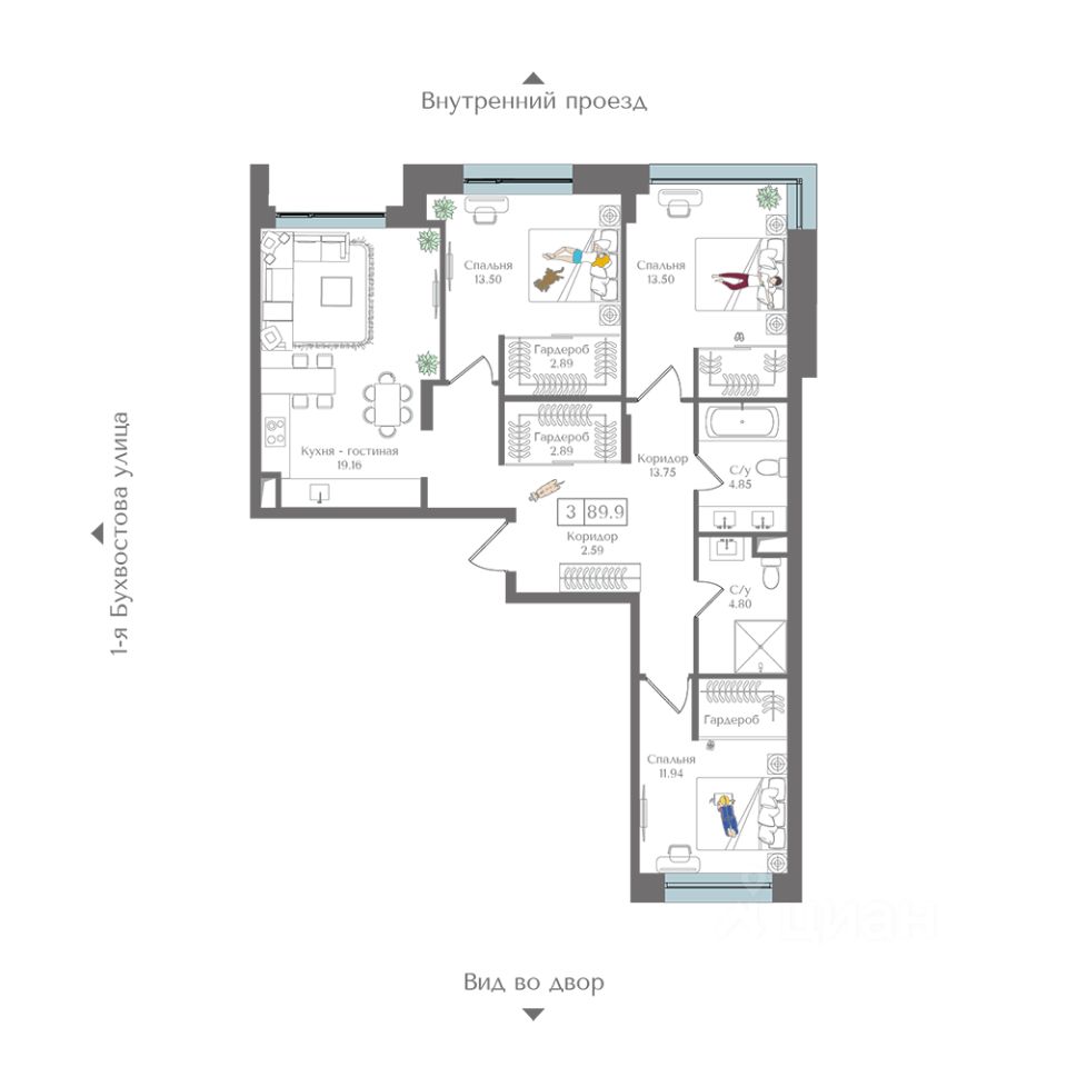 Продаётся 3-комнатная квартира в сданном доме (Корпус 1 (I очередь)), срок сдачи: II-кв. 2025, общей площадью 89.9 кв.м., на 2 этаже. Жилой комплекс с подземной автостоянкой, отдельно стоящими ДОУ, БНК (учебный корпус) и многофункциональным центром.