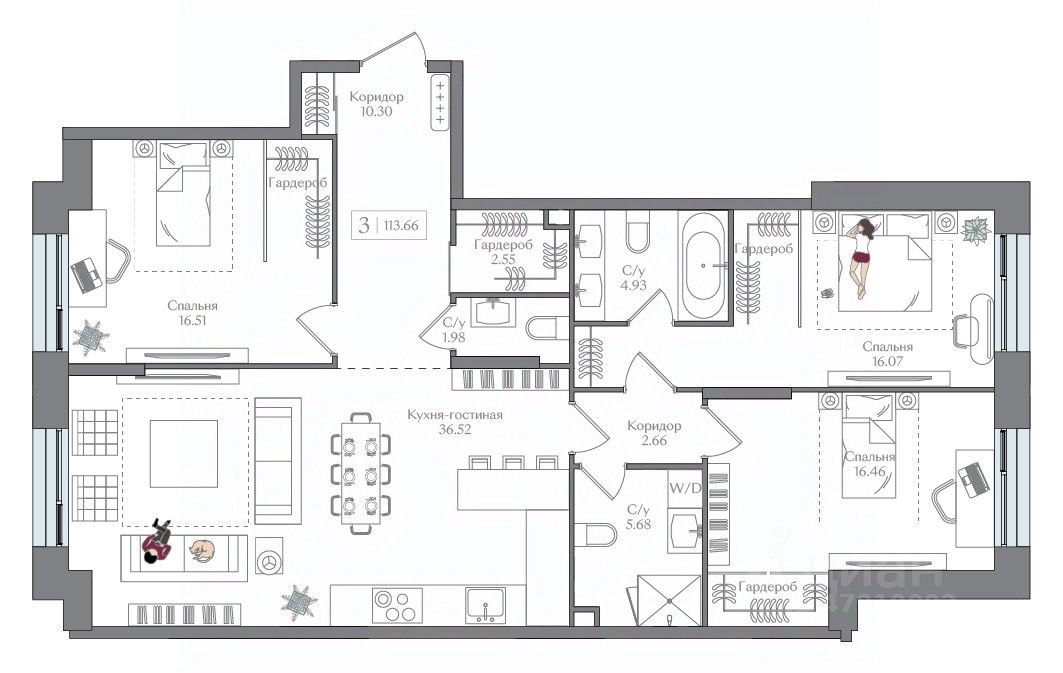 Продаётся 3-комнатная квартира в строящемся доме (Корпус 5 (II очередь)), срок сдачи: II-кв. 2027, общей площадью 113.66 кв.м., на 4 этаже. Жилой комплекс с подземной автостоянкой, отдельно стоящими ДОУ, БНК (учебный корпус) и многофункциональным центром.