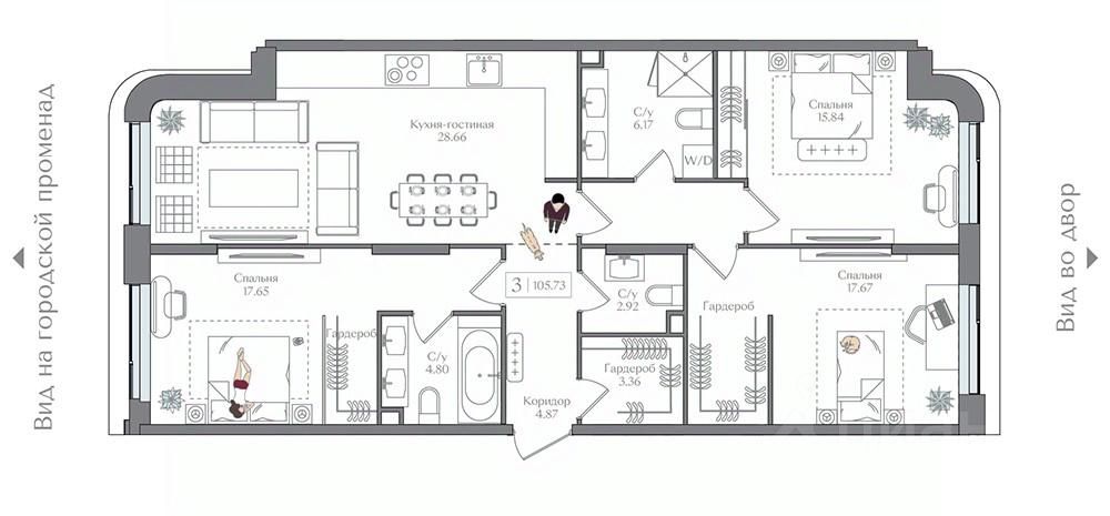 Продаётся 3-комнатная квартира в строящемся доме (Корпус 5 (II очередь)), срок сдачи: II-кв. 2027, общей площадью 105.72 кв.м., на 3 этаже. Жилой комплекс с подземной автостоянкой, отдельно стоящими ДОУ, БНК (учебный корпус) и многофункциональным центром.