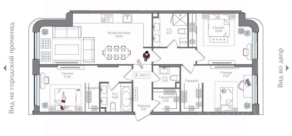 Продаётся 3-комнатная квартира в строящемся доме (Корпус 5 (II очередь)), срок сдачи: II-кв. 2027, общей площадью 105.72 кв.м., на 4 этаже. Жилой комплекс с подземной автостоянкой, отдельно стоящими ДОУ, БНК (учебный корпус) и многофункциональным центром.