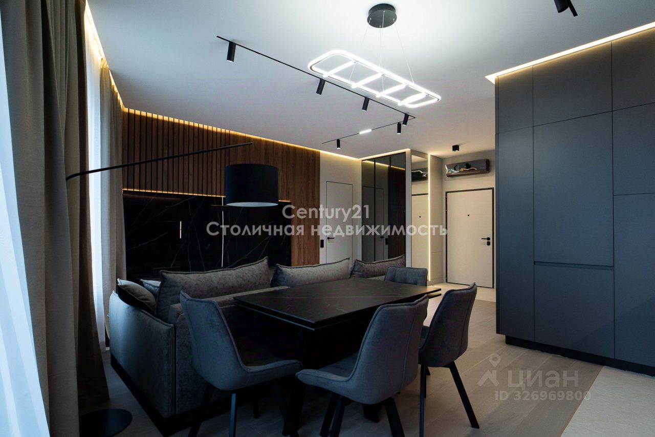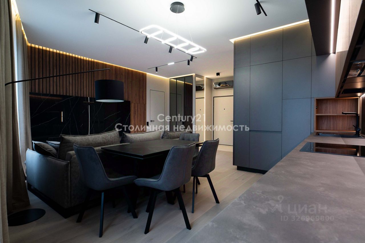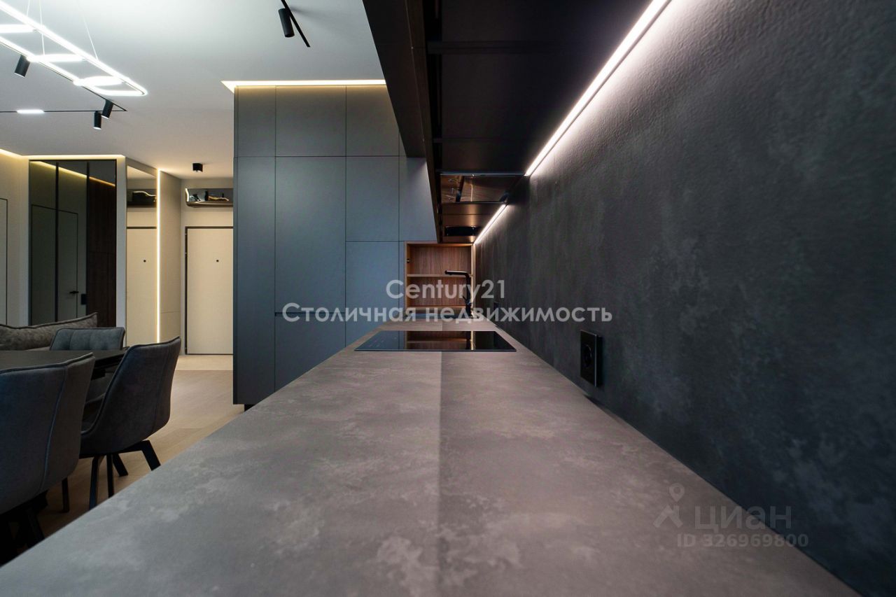 Выполнена дизайнерская отделка в современном стиле, продуманы различные сценарии освещения КВАРТИРА: Планировка представляет собой большую просторную кухню-гостиную, изолированную спальню, гардеробную и два сан узла. Квартира оборудована всей необходимой мебелью и техникой для комфортного проживания: - Натуральный камень и декоративные панели в отделке - Мебель из МДФ, изготовленная по индивидуальному заказу. - Черновая сантехника Rehau. - Электрическая система с использованием автоматов ABB. - Установлена система от протечки Нептун. - Система кондиционирования.