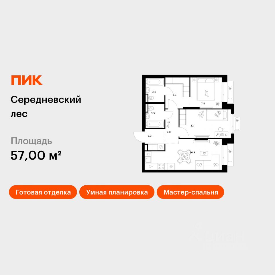 Продаётся 2-комн. квартира площадью 57 кв.м на 2 этаже 16 этажного дома (Корпус 2.1.5, Секция 5) проекта ПИК Середневский лес. Светлый просторный подъезд на уровне земли, функциональная планировка, большие окна, c отделкой.