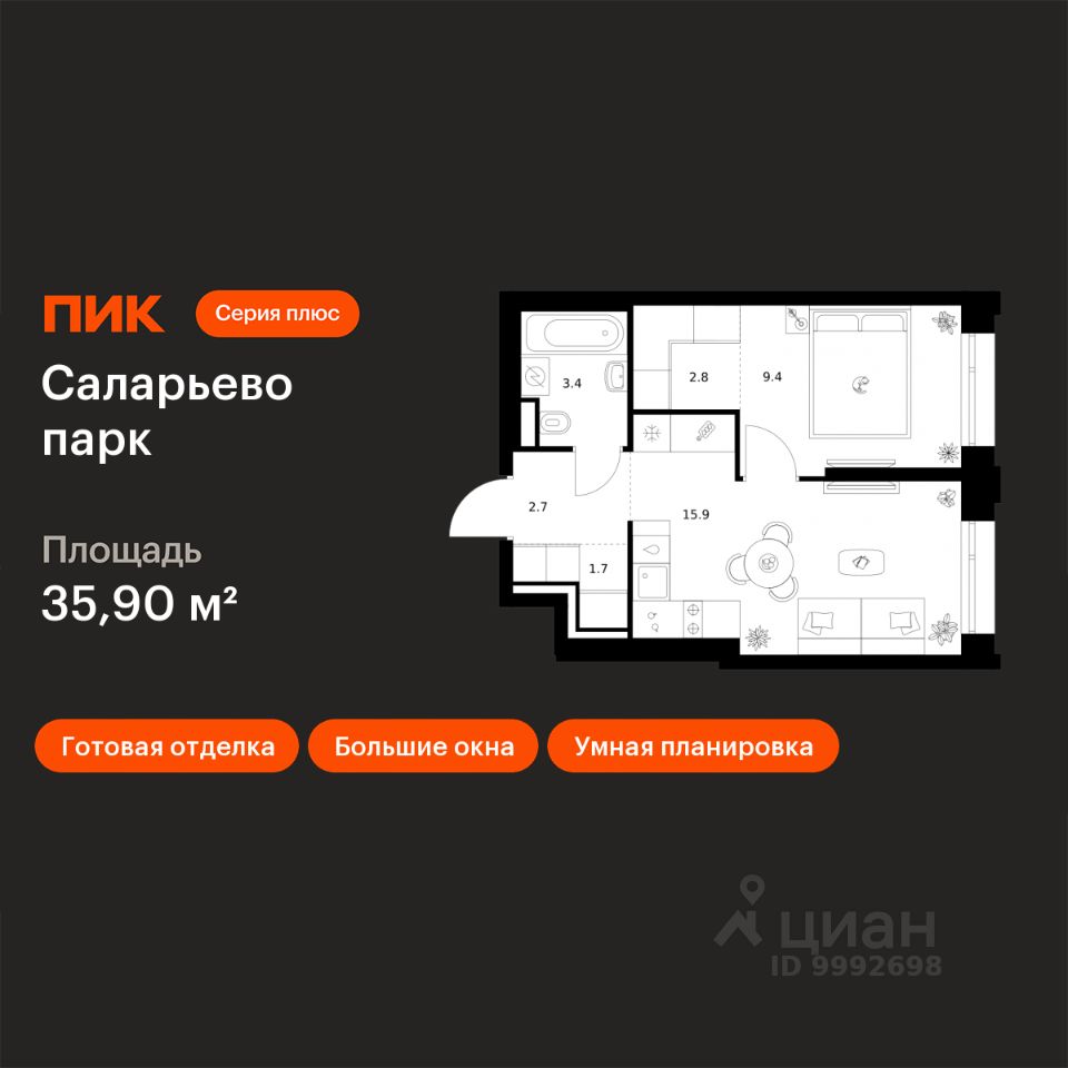 Продаётся 1-комн. квартира площадью 35,9 кв.м на 17 этаже 24 этажного дома (Корпус 82.8, Секция 8) проекта ПИК Саларьево парк. Светлый просторный подъезд на уровне земли, функциональная планировка, большие окна, c отделкой.