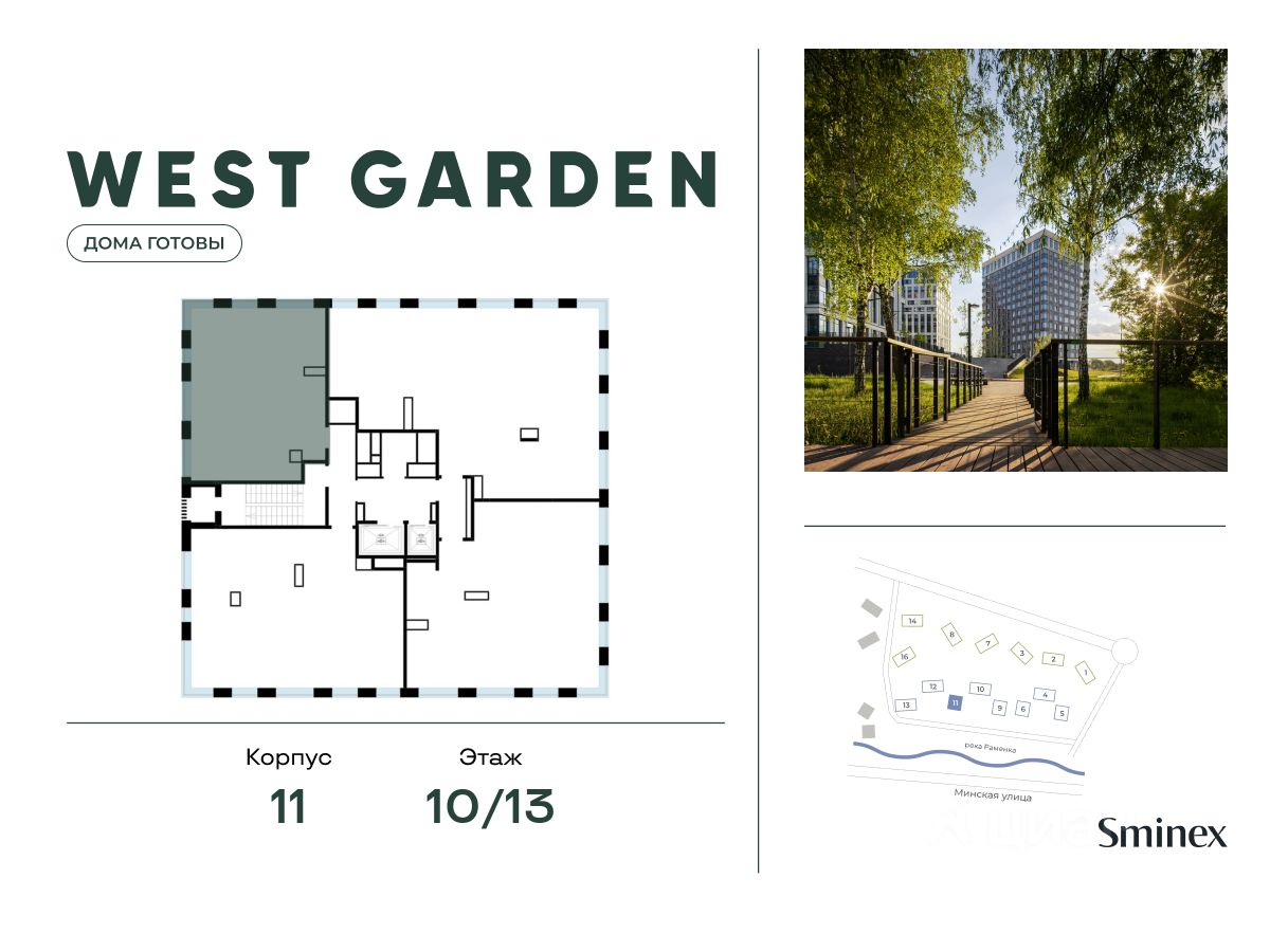 West Garden - это собрание клубных домов высотой 12-14 этажей в собственном парке 16 гектаров вдоль реки. Просторный среднеэтажный квартал расположен на Минской улице, в респектабельном Западном округе столицы. Вокруг премиальное окружение и более 1000 гектаров парков.