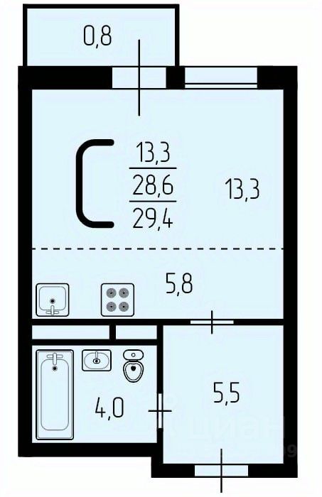 Квартира-студия площадью 28.8 квадратных метров, идеально подходящая для комфортной жизни одного человека или пары.