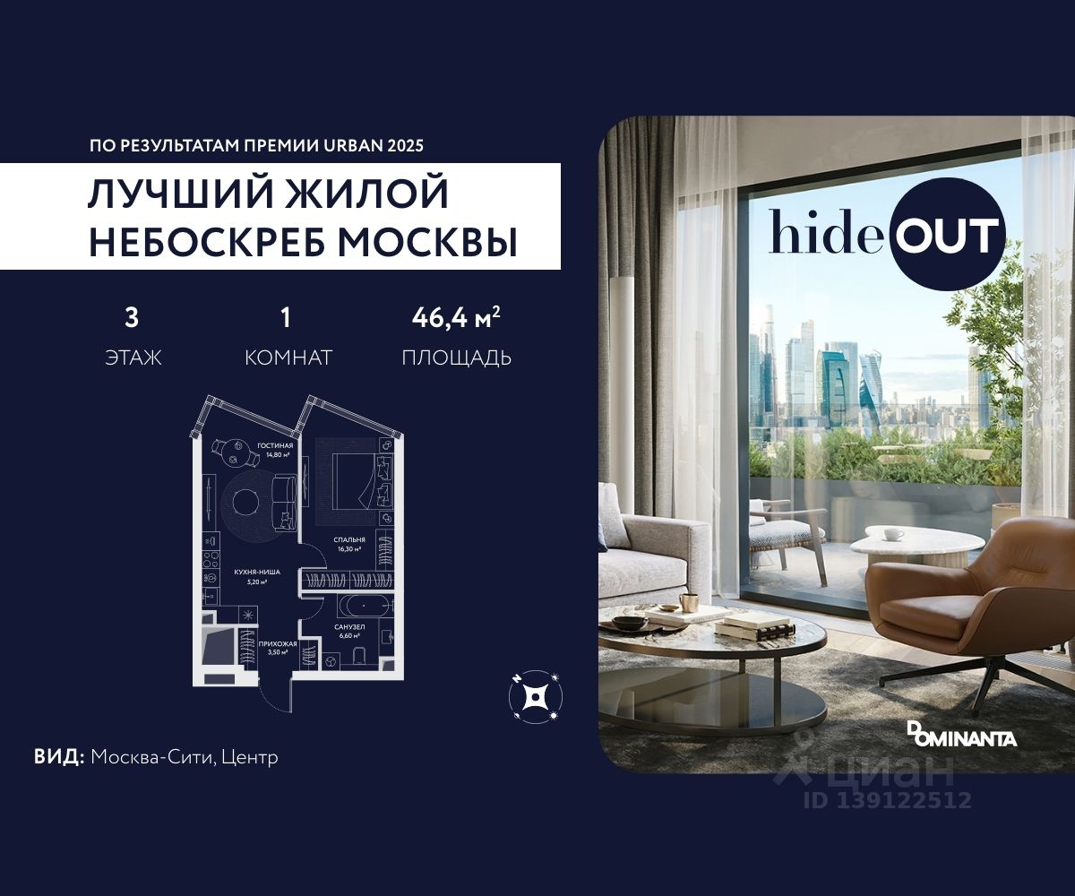 Прямая продажа от застройщика. Продается 2-комнатная квартира площадью 46.4 кв.м. на 5-м этаже 34-этажного дома в ЖК hideOUT с панорамными видами: Москва-Сити, Центр. Высота потолков 3,25 м. hideOUT — премиальный проект компании Dominanta. Это новый уровень жизни и комфорта без компромиссов. Две башни — 34 и 49 этажей — открывают захватывающие виды на Москву. Архитектурной доминантой проекта становится мост, соединяющий башни на высоте 80 метров. Закрытая территория, охрана 24/7, зона экстренной безопасности на подземном уровне, система пожаротушения. На мосту между башнями на 22-м этаже находится SocialHUB — предусмотрено 16 комфортных пространств для работы, отдыха и развлечений с панорамными видами и клубным форматом доступа.
