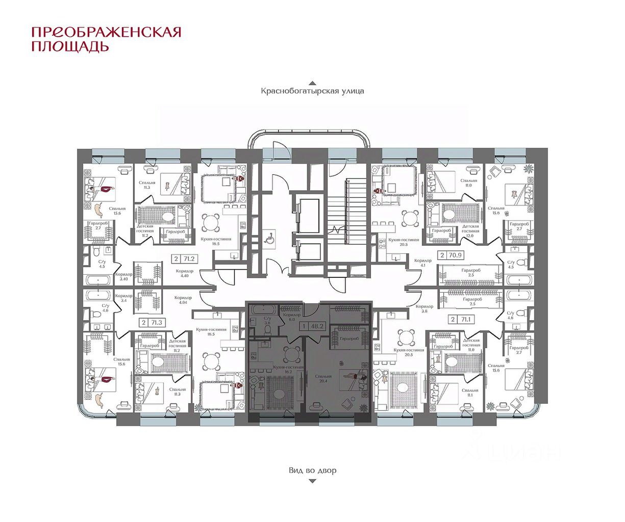 Квартира на 9 этаже в жилом комплексе премиум-класса ''Преображенская площадь''. Общая площадь: 48.2 кв.м.