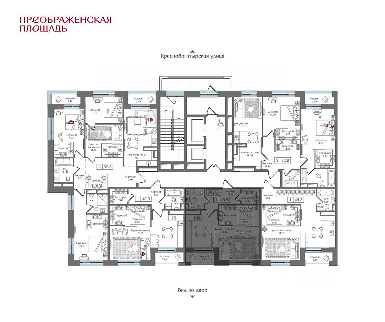 Квартира на 12 этаже в жилом комплексе премиум-класса ''Преображенская площадь''. Общая площадь: 45.5 кв.м.