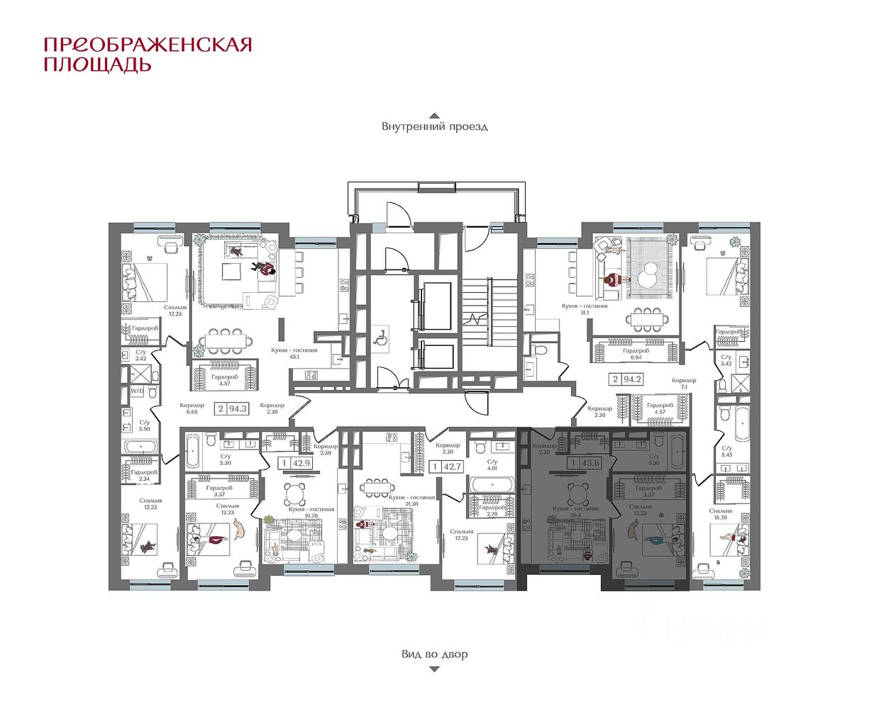 Квартира на 15 этаже в жилом комплексе премиум-класса ''Преображенская площадь''. Общая площадь: 43.6 кв.м.