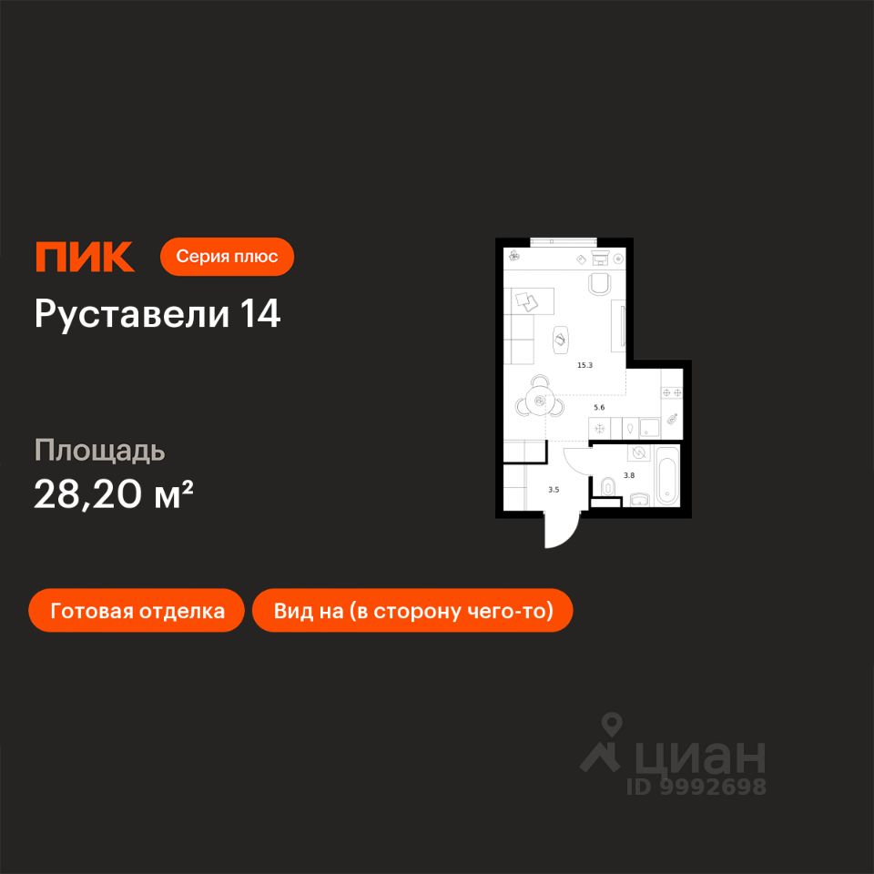 Продаётся квартира-студия площадью 28,2 кв.м на 16 этаже 21 этажного дома (Корпус 3.5, Секция 1) проекта ПИК Руставели 14. Светлый просторный подъезд на уровне земли, функциональная планировка, большие окна, c отделкой.