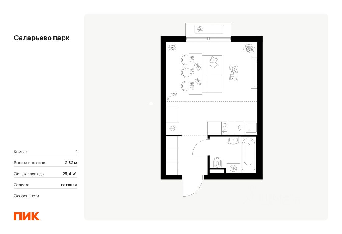 Продаётся квартира-студия площадью 25,4 кв.м на 14 этаже 16 этажного дома (Корпус 74.7, Секция 7) проекта ПИК Саларьево парк. Светлый просторный подъезд на уровне земли, функциональная планировка, большие окна, c отделкой.