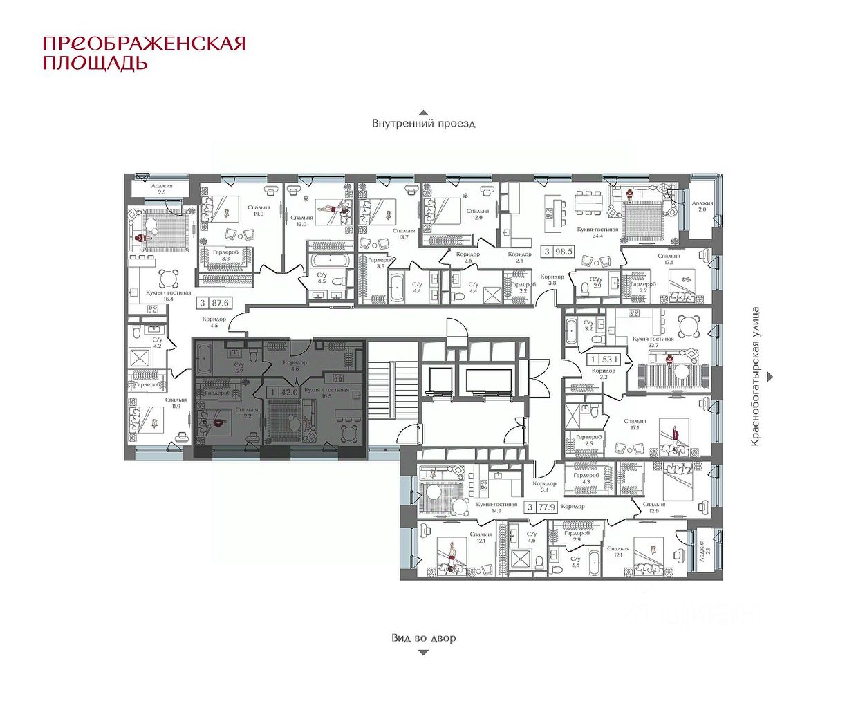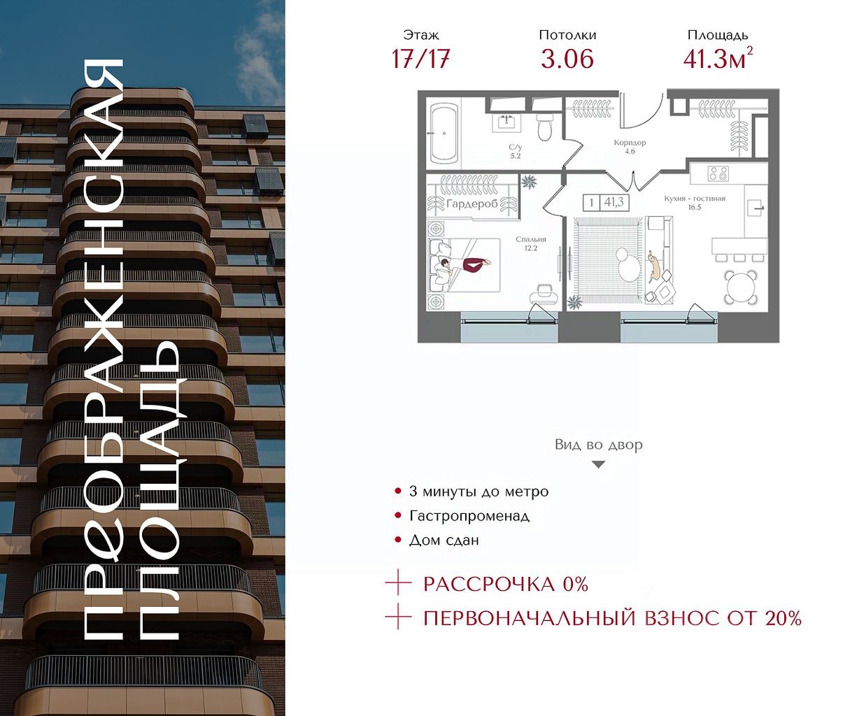 Квартира на 17 этаже в жилом комплексе премиум-класса ''Преображенская площадь''. Общая площадь: 41.3 кв.м.