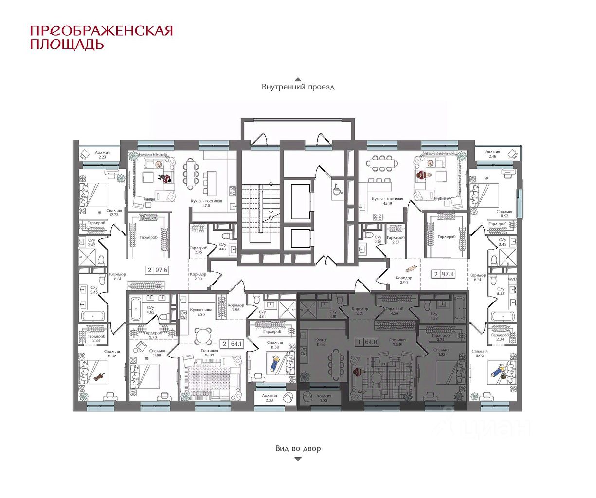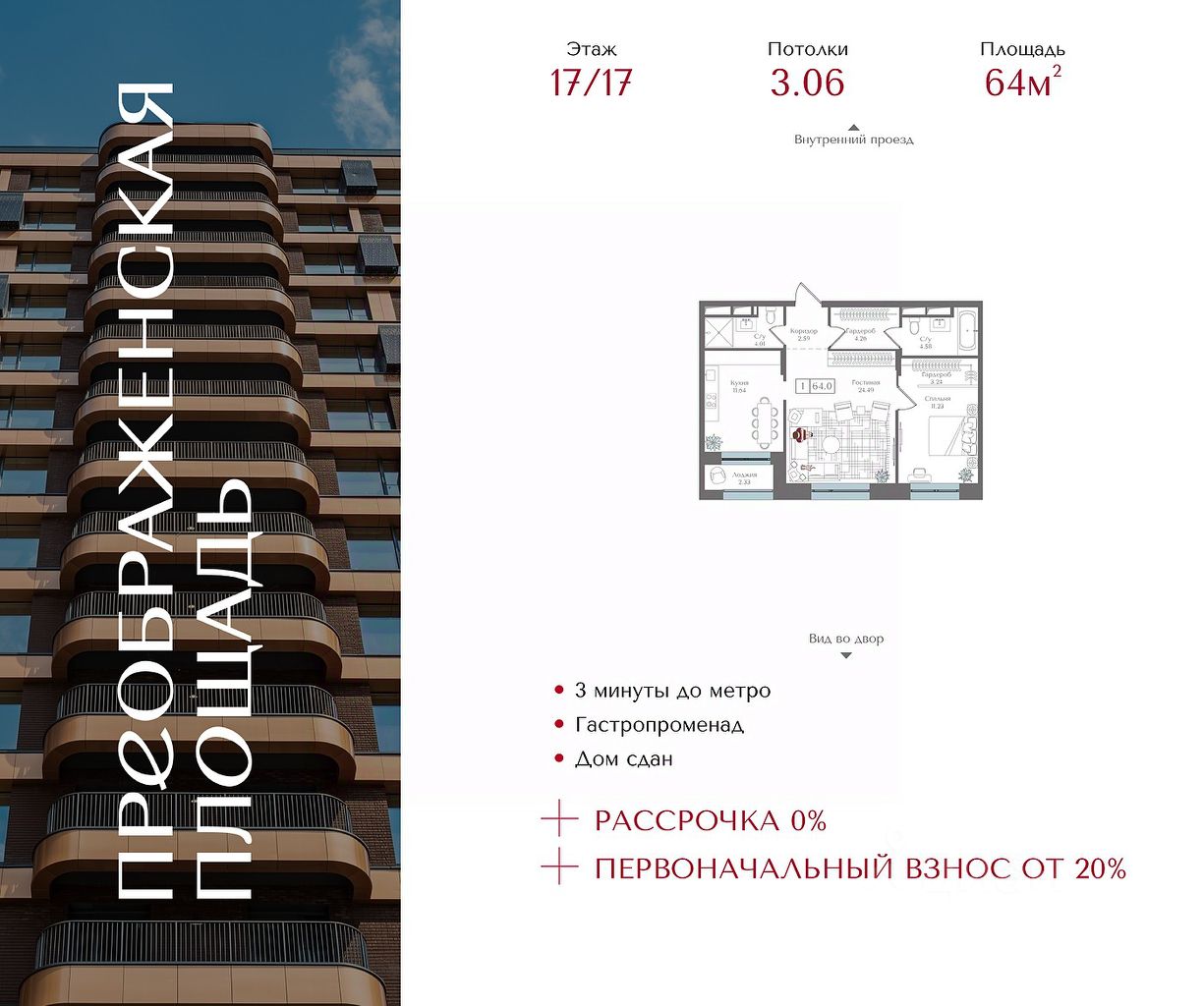 Квартира на 17 этаже в жилом комплексе премиум-класса ''Преображенская площадь''. Общая площадь: 64 кв.м.