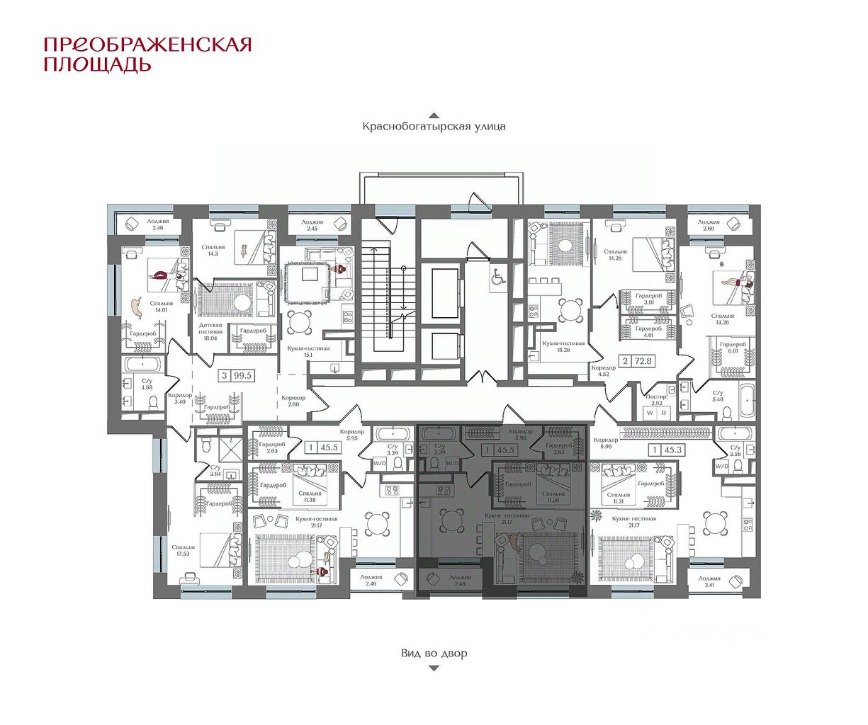 Квартира на 13 этаже в жилом комплексе премиум-класса ''Преображенская площадь''. Общая площадь: 45.5 кв.м.