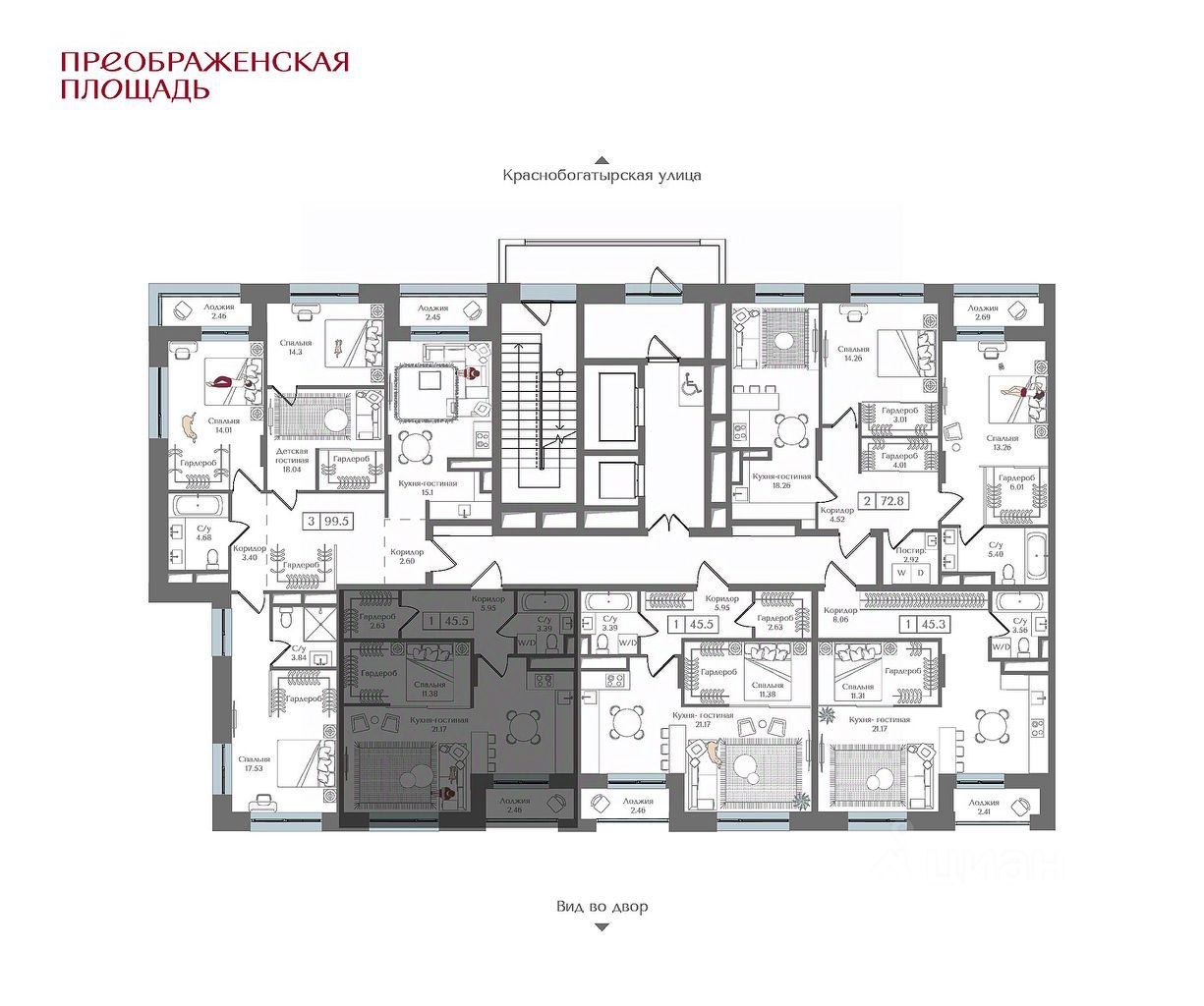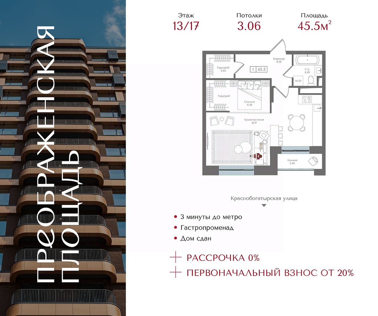 Квартира на 13 этаже в жилом комплексе премиум-класса ''Преображенская площадь''. Общая площадь: 45.5 кв.м.