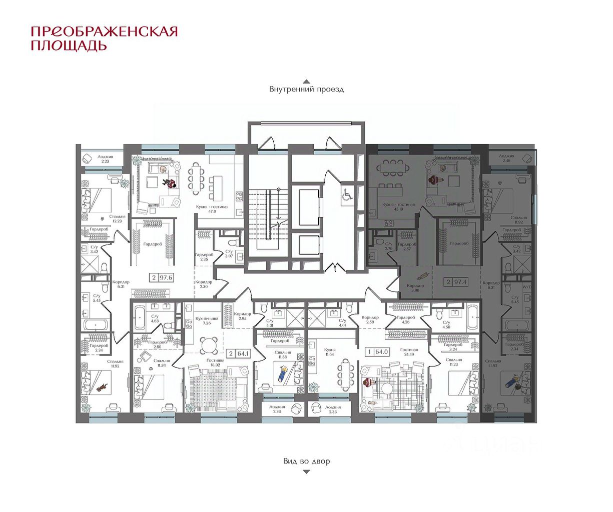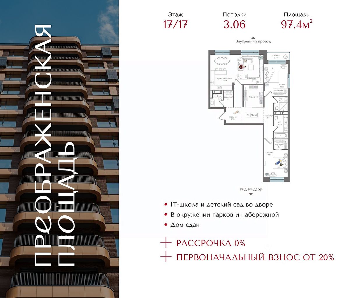 Квартира на 17 этаже в жилом комплексе премиум-класса ''Преображенская площадь''. Общая площадь: 97.4 кв.м.