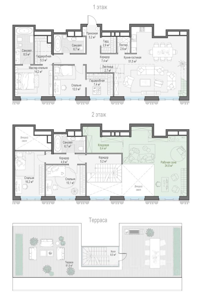 В парке созданы крытые галереи и приватные зелёные комнаты для отдыха и медитаций в любую погоду. Насыщенное озеленение многолетними растениями с разными периодами цветения сохраняет территорию квартала красивой круглый год.