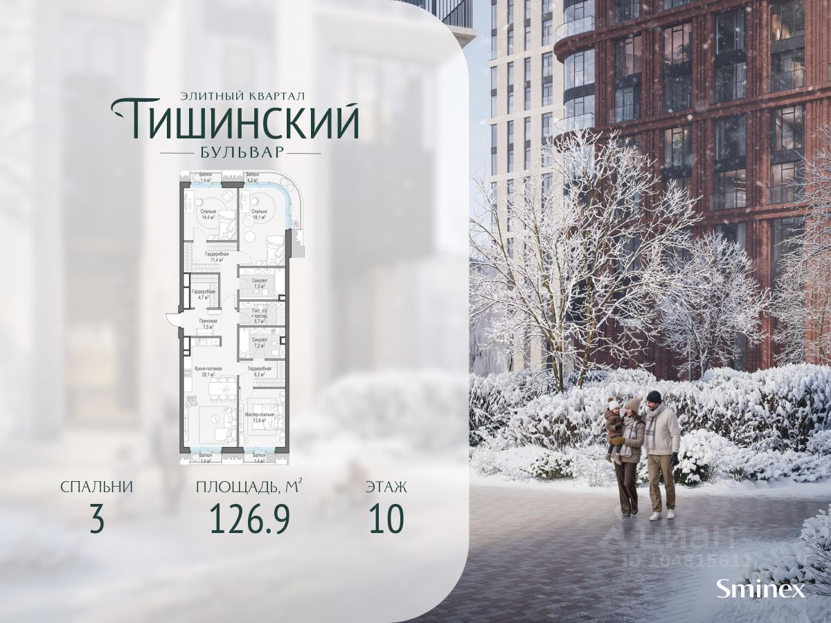 В продаже 3-комнатная квартира квартира в элитном квартале ''Тишинский бульвар''. Общая площадь квартиры - 126.90 кв.м. Этаж 10 из 14. Корпус К4С1.