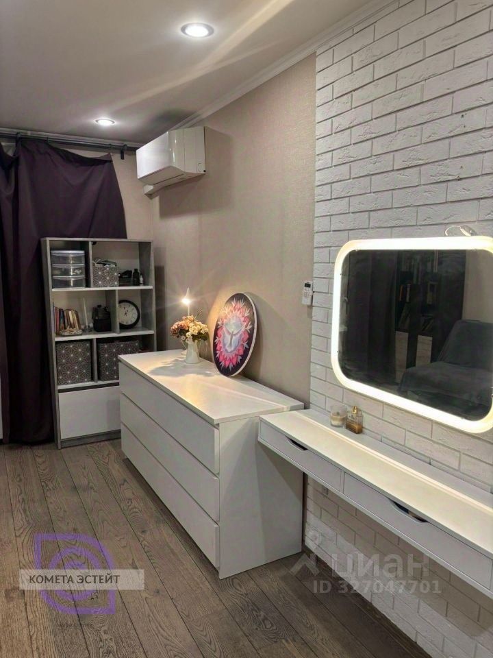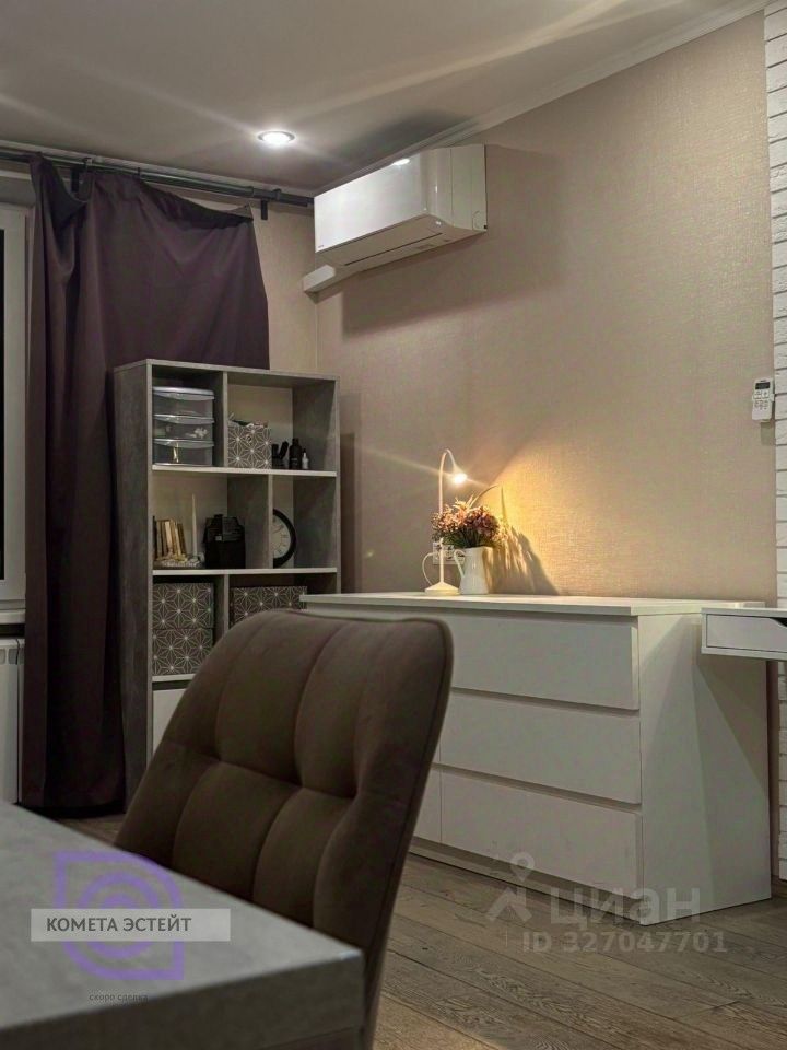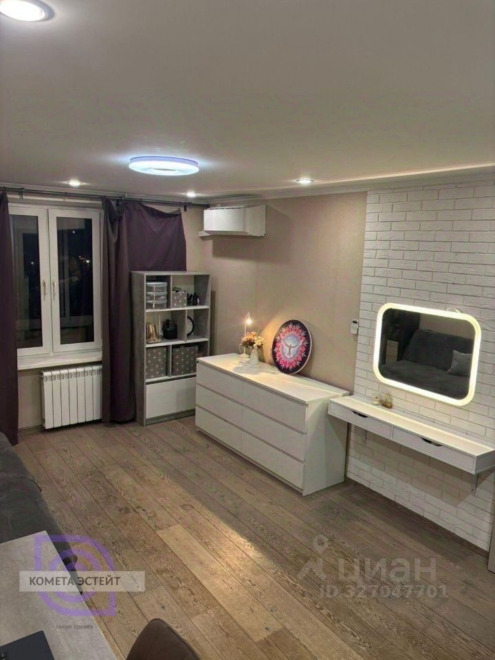 **Характеристики квартиры:** * общая площадь: 32,3 м², * ремонт: капитальный (новая электрика и сантехника), * потолки: гипсокартон со встроенными светильниками, * ванная: плитка Kerama Marazzi, качественная сантехника, гидроизоляция, * двери: новая входная, белые межкомнатные, * дополнительные элементы: застеклённая лоджия с раздвижными окнами, кондиционер, * кухня: 10 м², с диваном (возможность зонирования), * мебель: часть остаётся (по договорённости — вся).