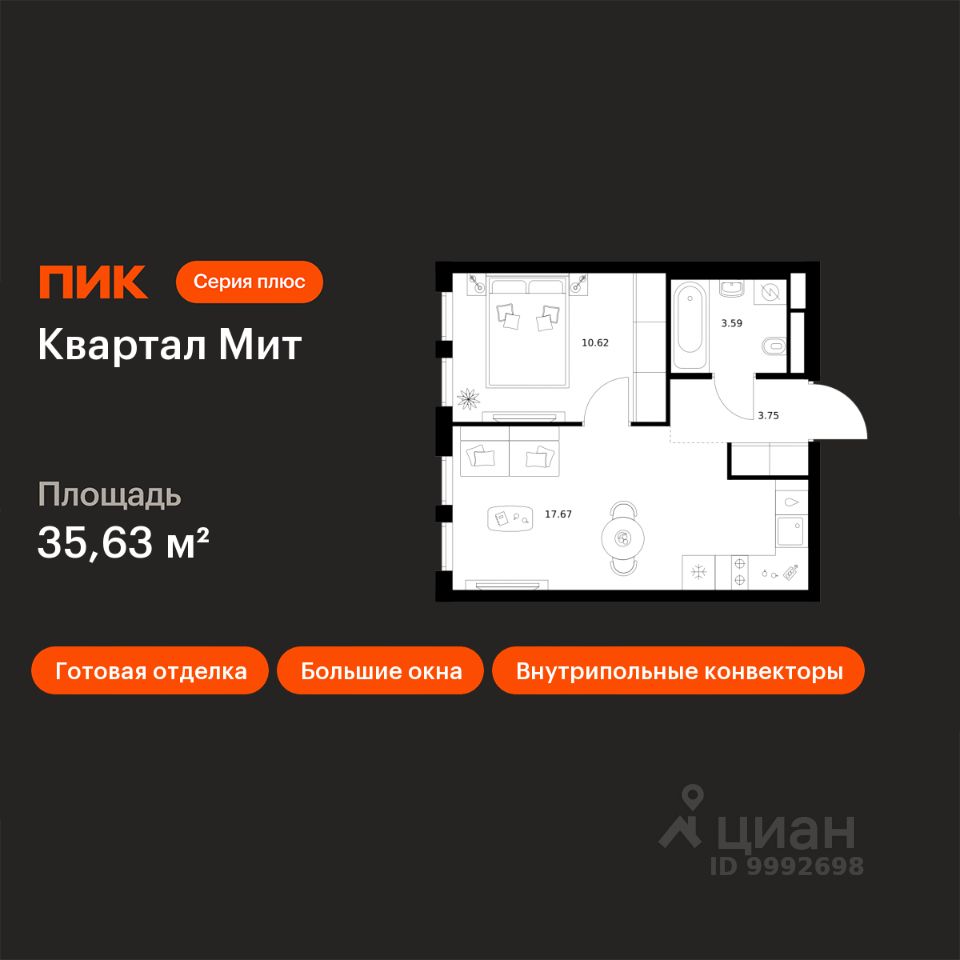 Новостройка! Продается 1-комн. кв-ра площадью 35,63 кв.м, (Корпус 3.6, Секция 7) 7 этаж 15-этажного дома в Квартал Мит от ПИК. ''Квартал Мит'' строится в экологически чистом районе Митино, где по соседству расположен большой лесопарк, а с двух сторон протекают реки Сходня и Журавка. Для семей с детьми здесь появится школа и два детских сада. В 20 минутах пешком находится станция метро ''Пятницкое шоссе'', а за 10 минут на автомобиле можно доехать до МКАД.