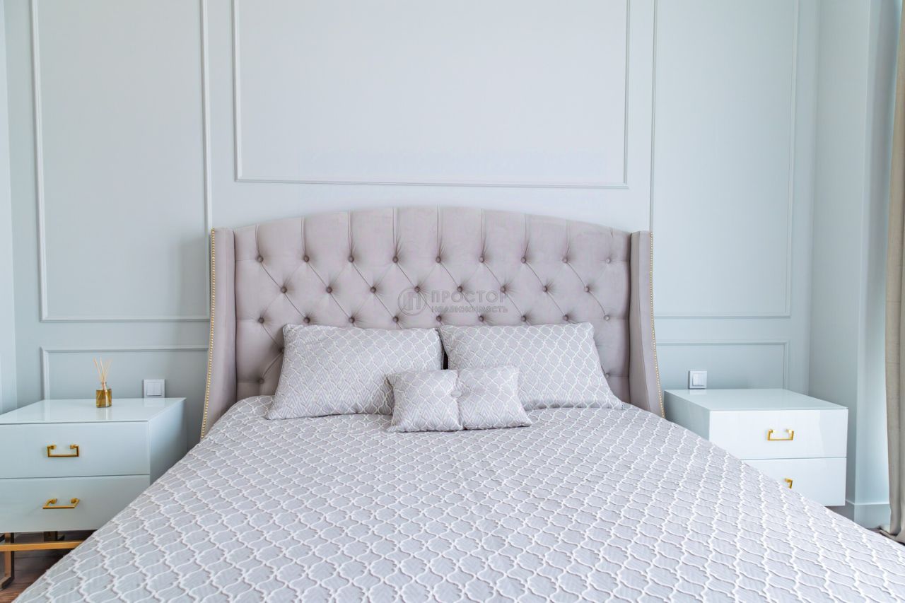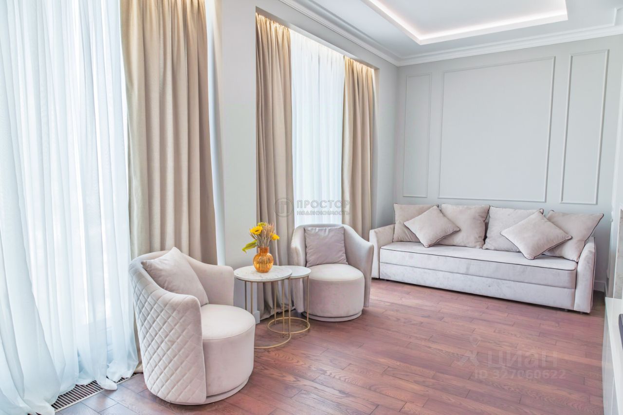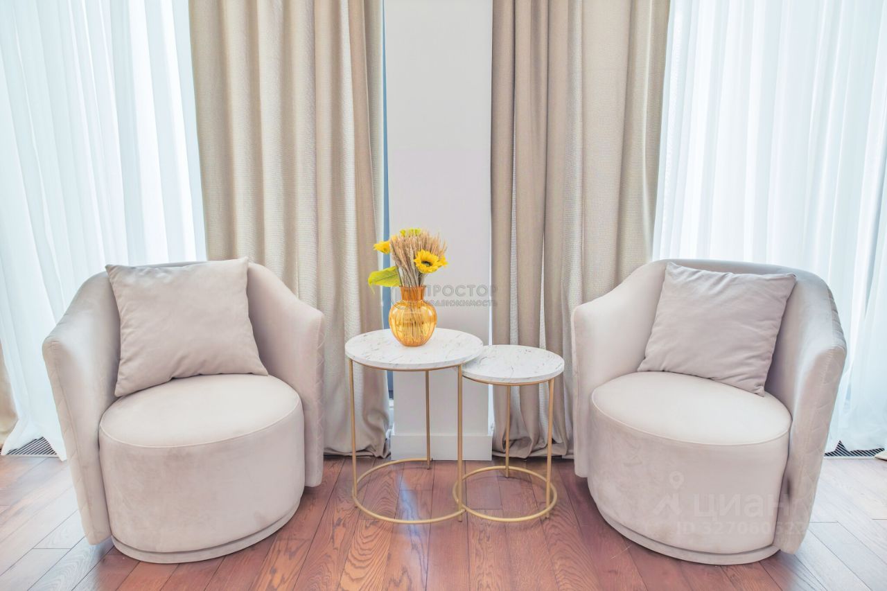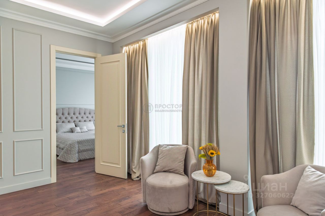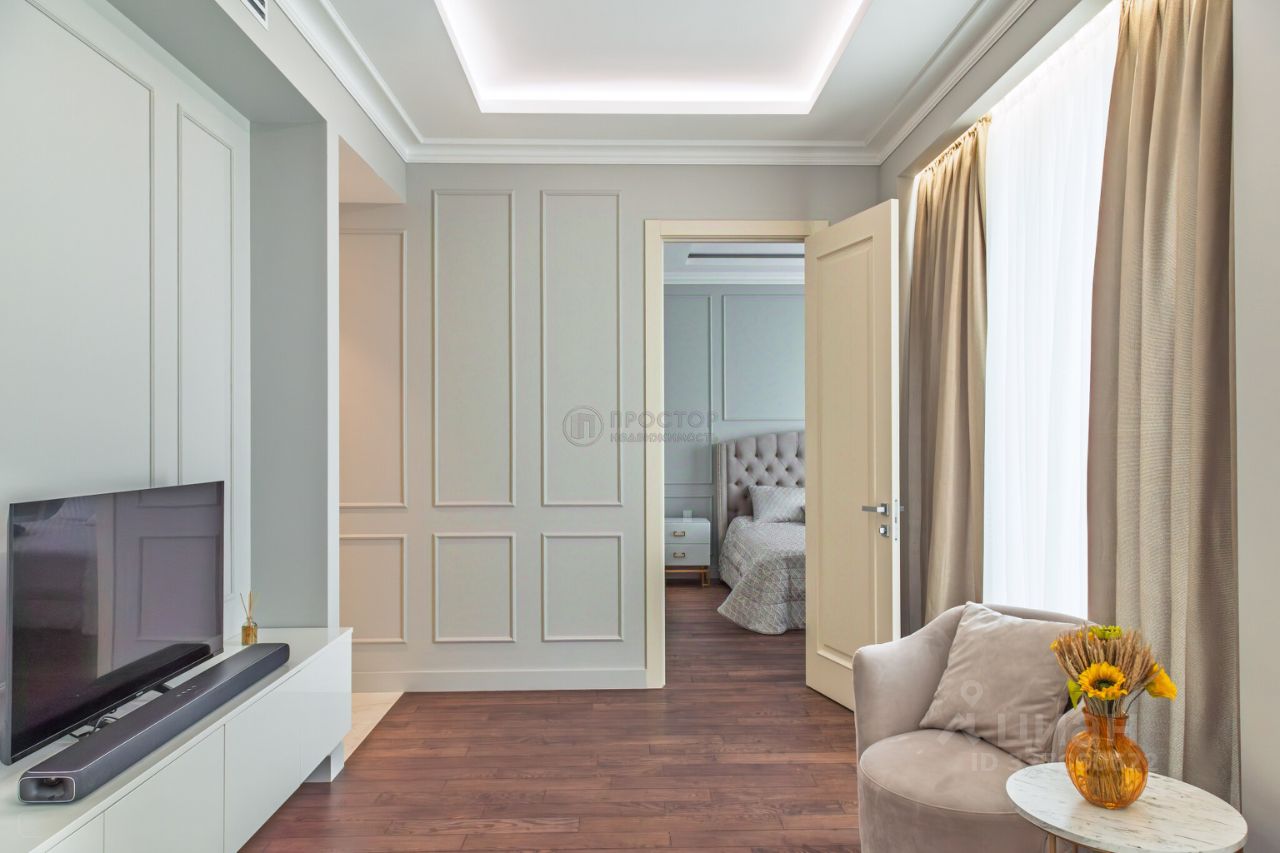 Интерьер выполнен в современном стиле с элементами классики: тёплый паркет, нейтральная палитра, дизайнерская мебель, встроенная техника. Установлена система приточно-вытяжной вентиляции с климат-контролем.