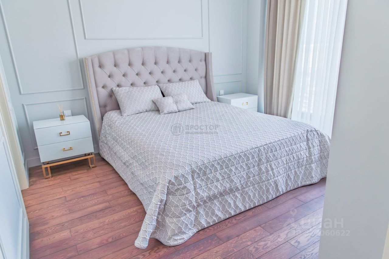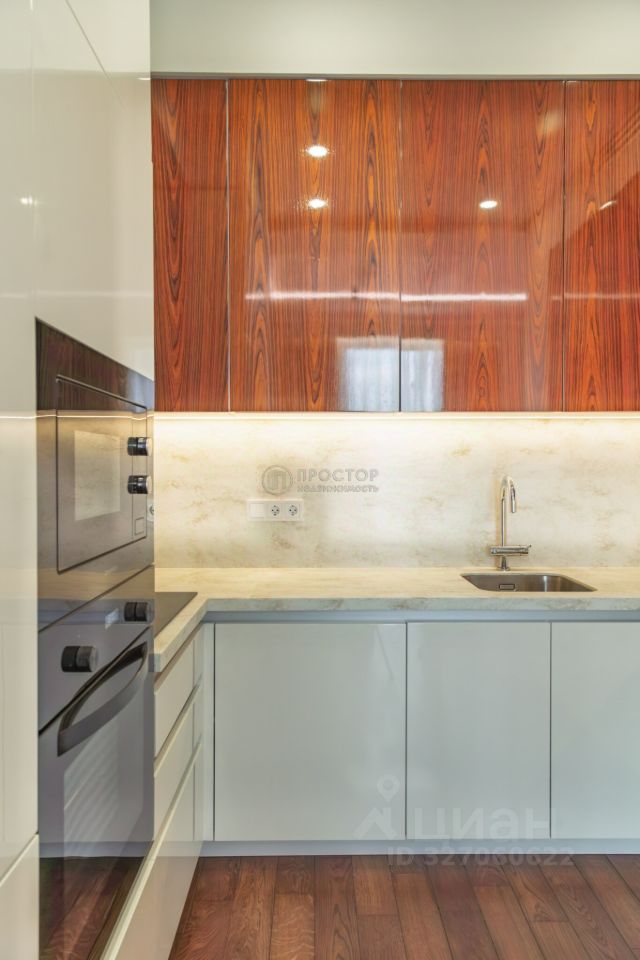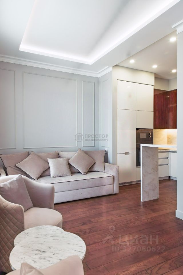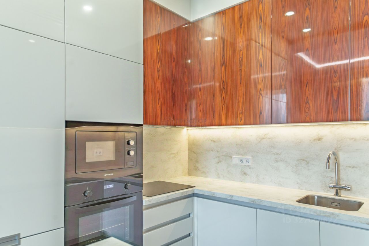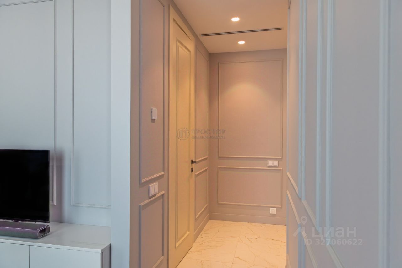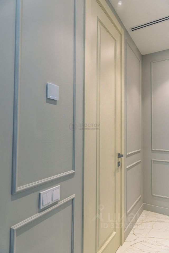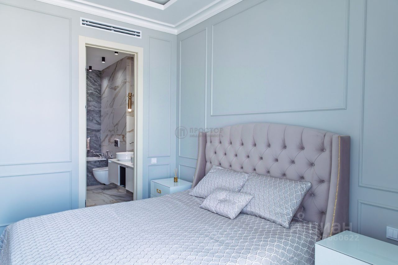 Интерьер выполнен в современном стиле с элементами классики: тёплый паркет, нейтральная палитра, дизайнерская мебель, встроенная техника. Установлена система приточно-вытяжной вентиляции с климат-контролем.