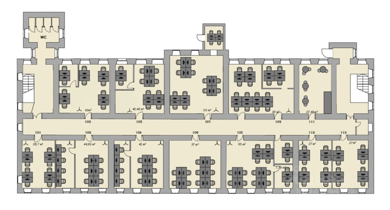 Конфигурация: 13 отдельных кабинетов от 27 до 65 м² для команд 8-16 человек