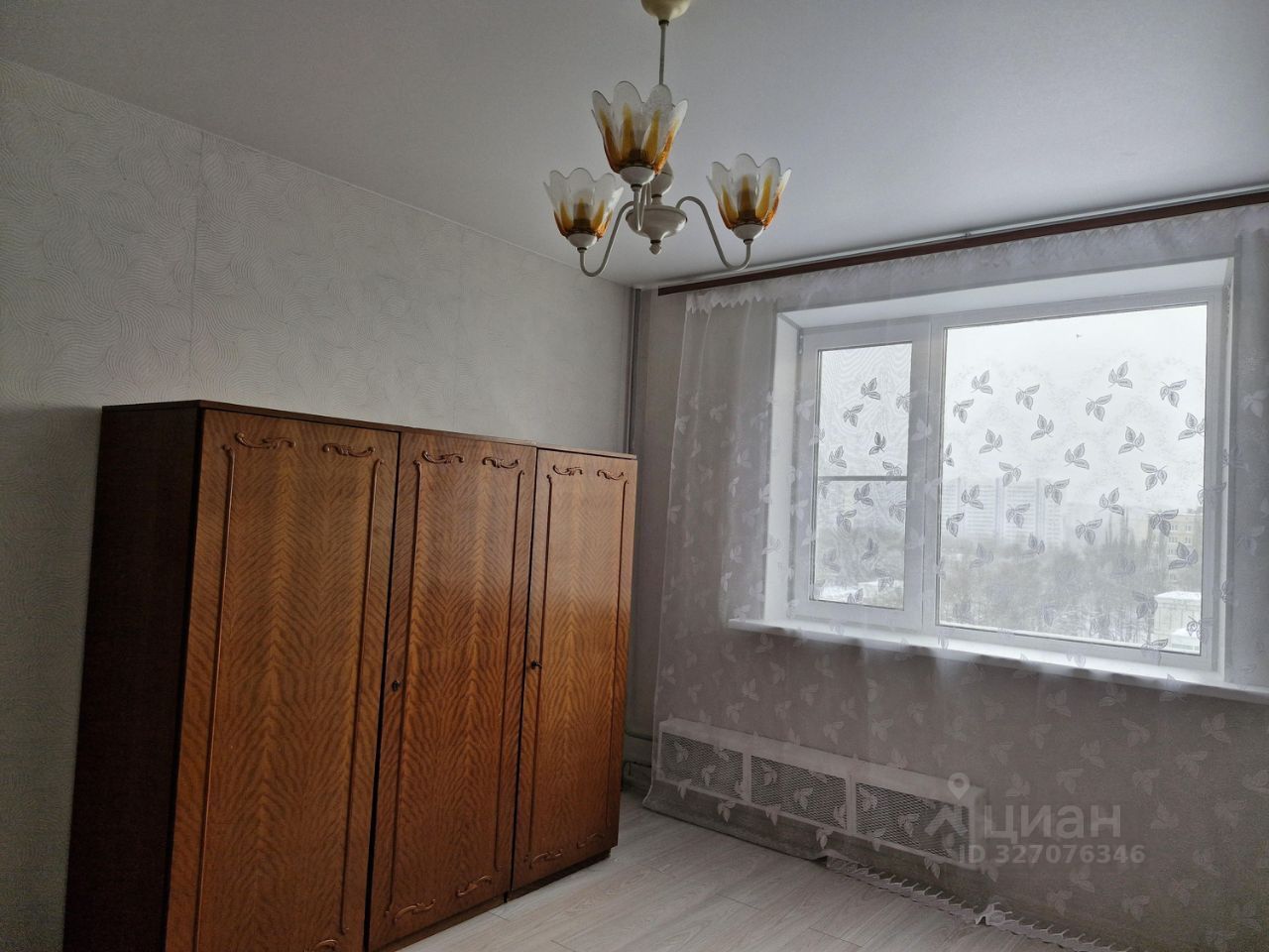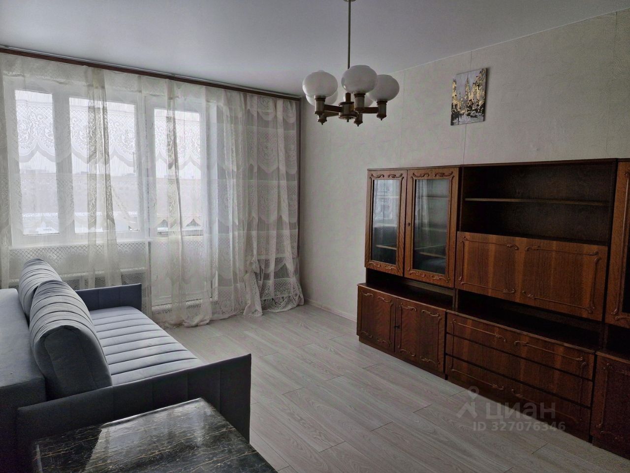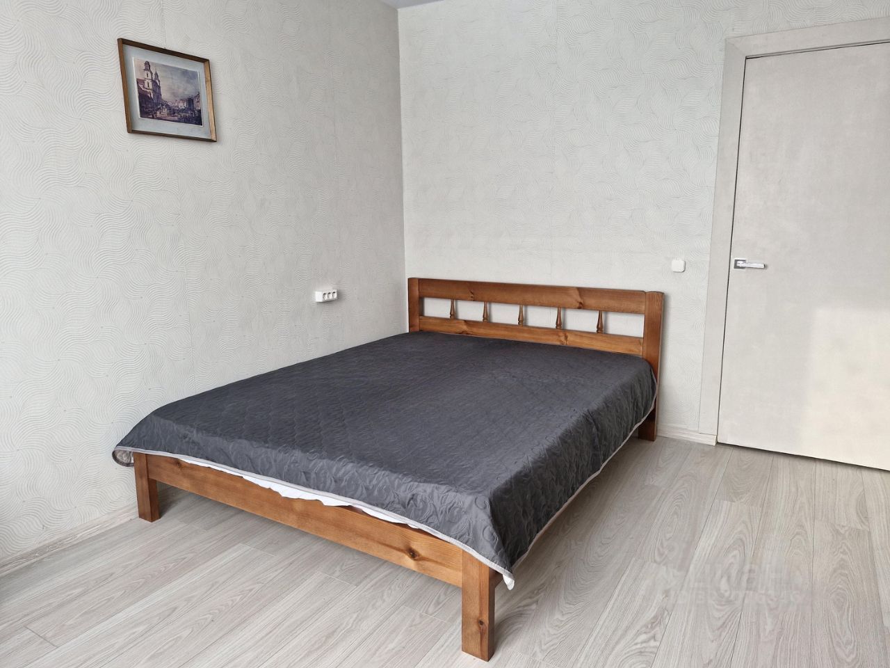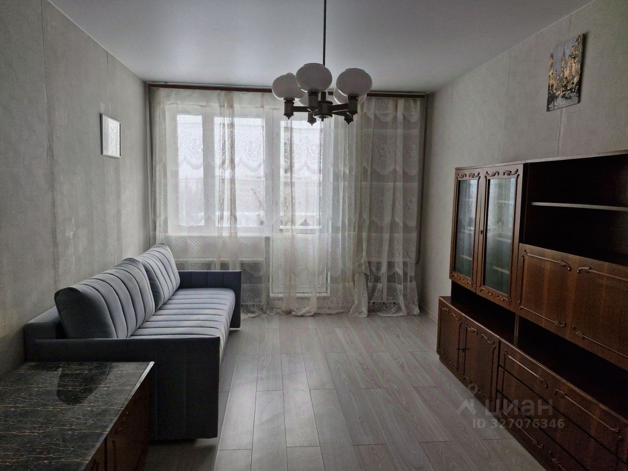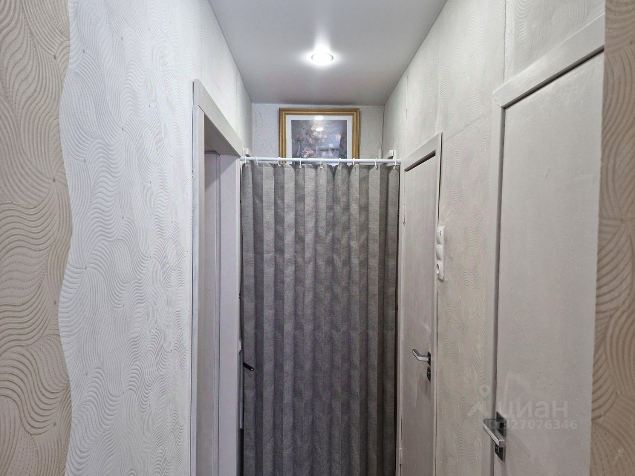 Интерьер прихожей - стены отделаны обоями с волнистым узором. На потолке установлена винтажная люстра с декоративными элементами. В правой части кадра расположена темная вешалка с зеркалом, полкой, крючками для одежды и скамейкой. Рядом с вешалкой на стене закреплен светильник с белым плафоном и золотистым основанием. Пол в прихожей покрыт светлым ламинатом. Диван в одной из комнат раскладывается, кровать двуспальная из массива дерева. Много мест для хранения. Раздельный санузел, что обеспечивает комфорт и удобство при сборе рано утром на работу. Данная квартира подходит для семьи.
