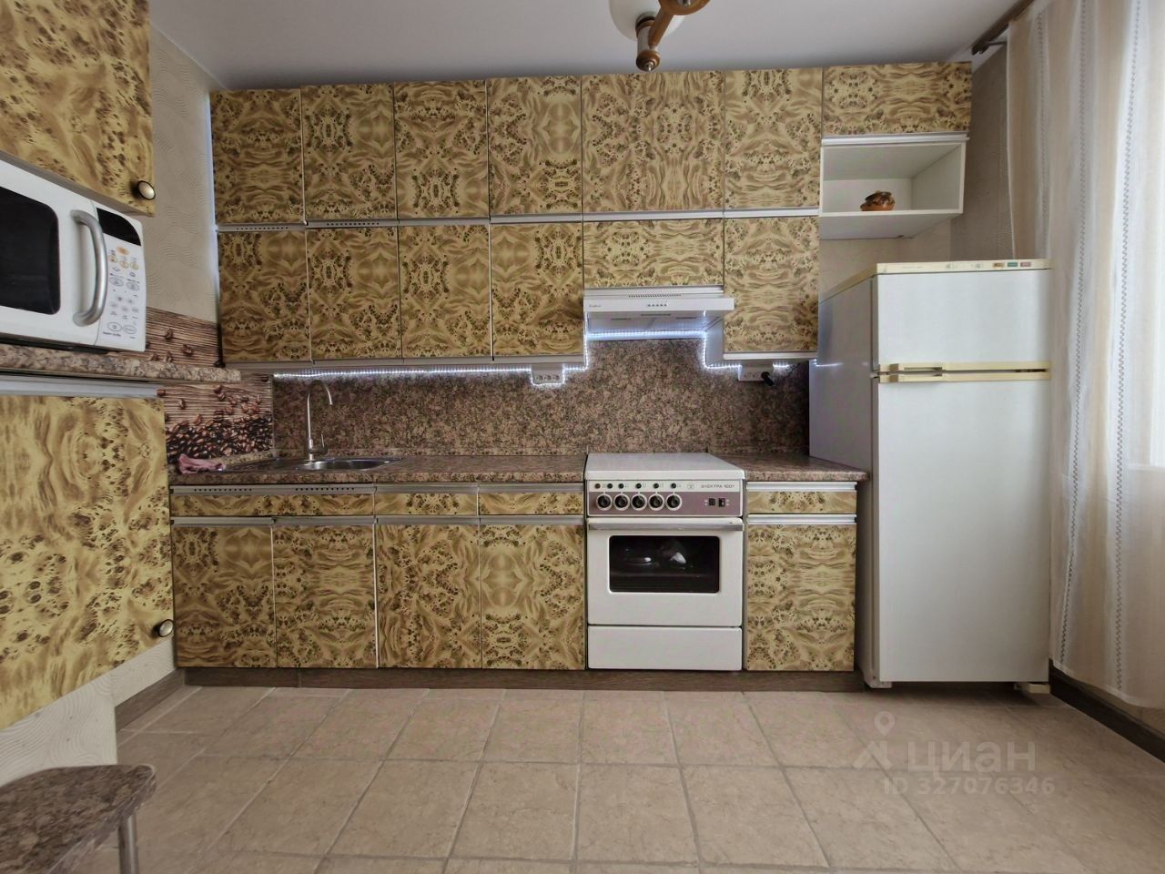 Кухонная мебель, включает навесные шкафы и нижние шкафы, имеет рисунок, имитирующий древесную текстуру, с преобладающими бежевыми и коричневыми оттенками. На стене слева от кухонной мебели расположена микроволновая печь. Над плитой расположена вытяжка. На кухне уложена плитка, что очень облегчает уборку.