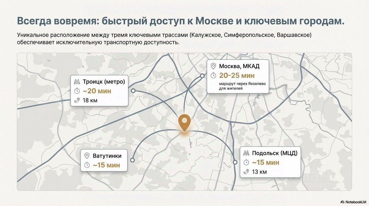 Удобный съезд на 3 ключевые трассы — Калужское шоссе, проспект Славского и Симферопольское и Варшавское шоссе, быстрый доступ к Москве, Троицку и Подольску.