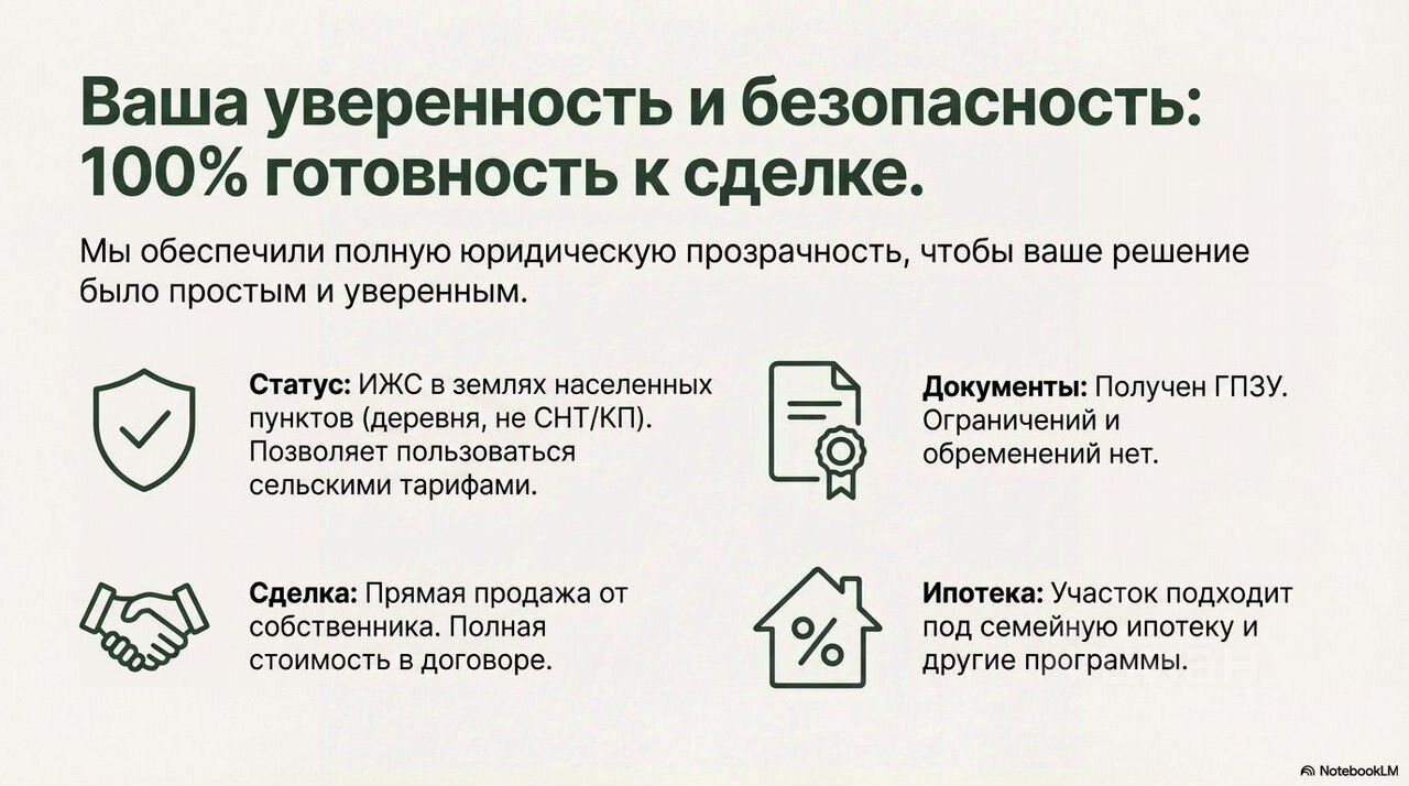 Участок 10 соток, Ижс, без ограничений и обременений, полная стоимость в договоре — подходит под семейную ипотеку.