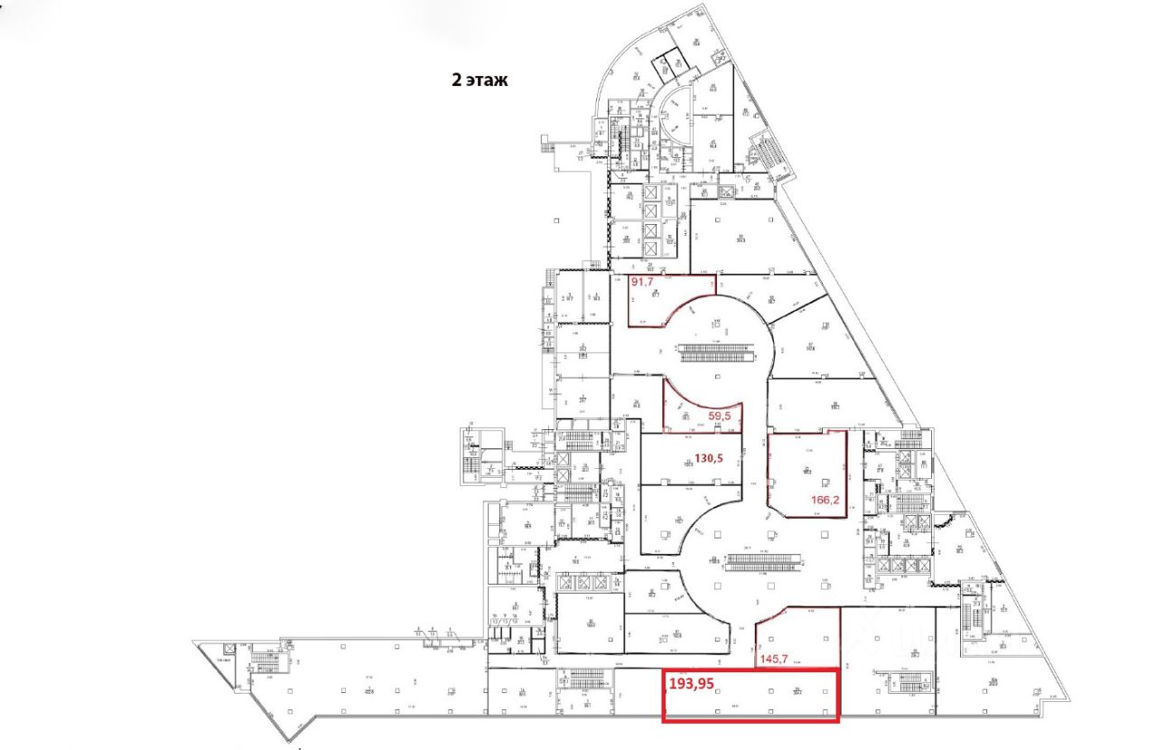 2 этаж. 193,95 кв.м - закрытый павильон БЕЗ отделки, в бетоне shell&core. БЕЗ окон. Помещение правильной прямоугольной формы. Имеется возможность проведения мокрых точек. Панорамное остекление. Требуется ремонт.