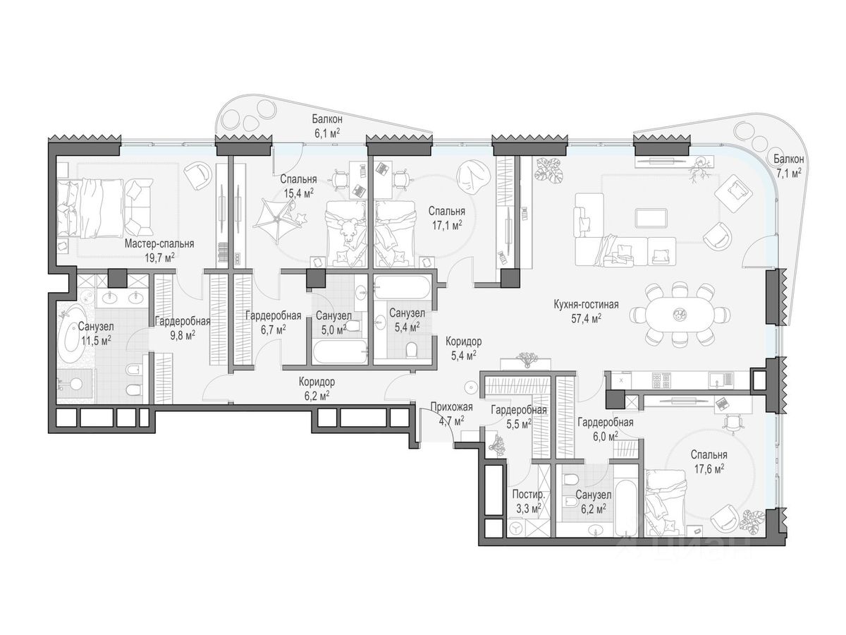 В проекте уникальный выбор квартир с просторными балконами, пентхаусов с террасами, бассейнами и каминами, максимальными видовыми характеристиками, а также роскошных вилл. Всего - 153 квартиры и 101 продуманное планировочное решение. Высота потолков составляет от 3,5 до 8,25 м. В доме предусмотрен 2х-уровневый паркинг на 279 машино-места.