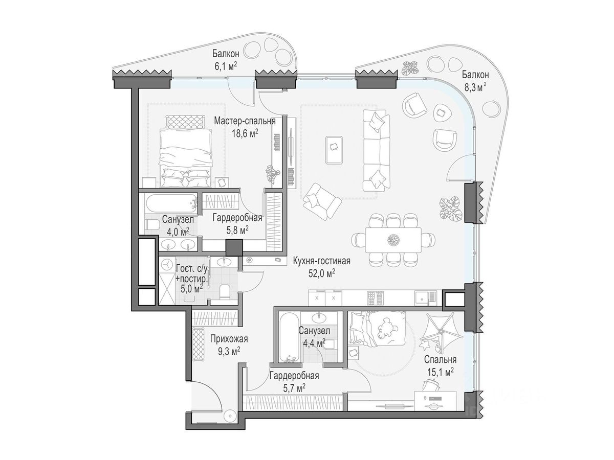 В проекте уникальный выбор квартир с просторными балконами, пентхаусов с террасами, бассейнами и каминами, максимальными видовыми характеристиками, а также роскошных вилл. Всего - 153 квартиры и 101 продуманное планировочное решение. Высота потолков составляет от 3,5 до 8,25 м. В доме предусмотрен 2х-уровневый паркинг на 279 машино-места.