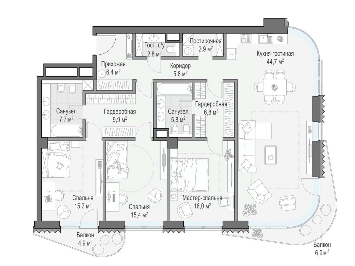 В проекте уникальный выбор квартир с просторными балконами, пентхаусов с террасами, бассейнами и каминами, максимальными видовыми характеристиками, а также роскошных вилл. Всего - 153 квартиры и 101 продуманное планировочное решение. Высота потолков составляет от 3,5 до 8,25 м. В доме предусмотрен 2х-уровневый паркинг на 279 машино-места.