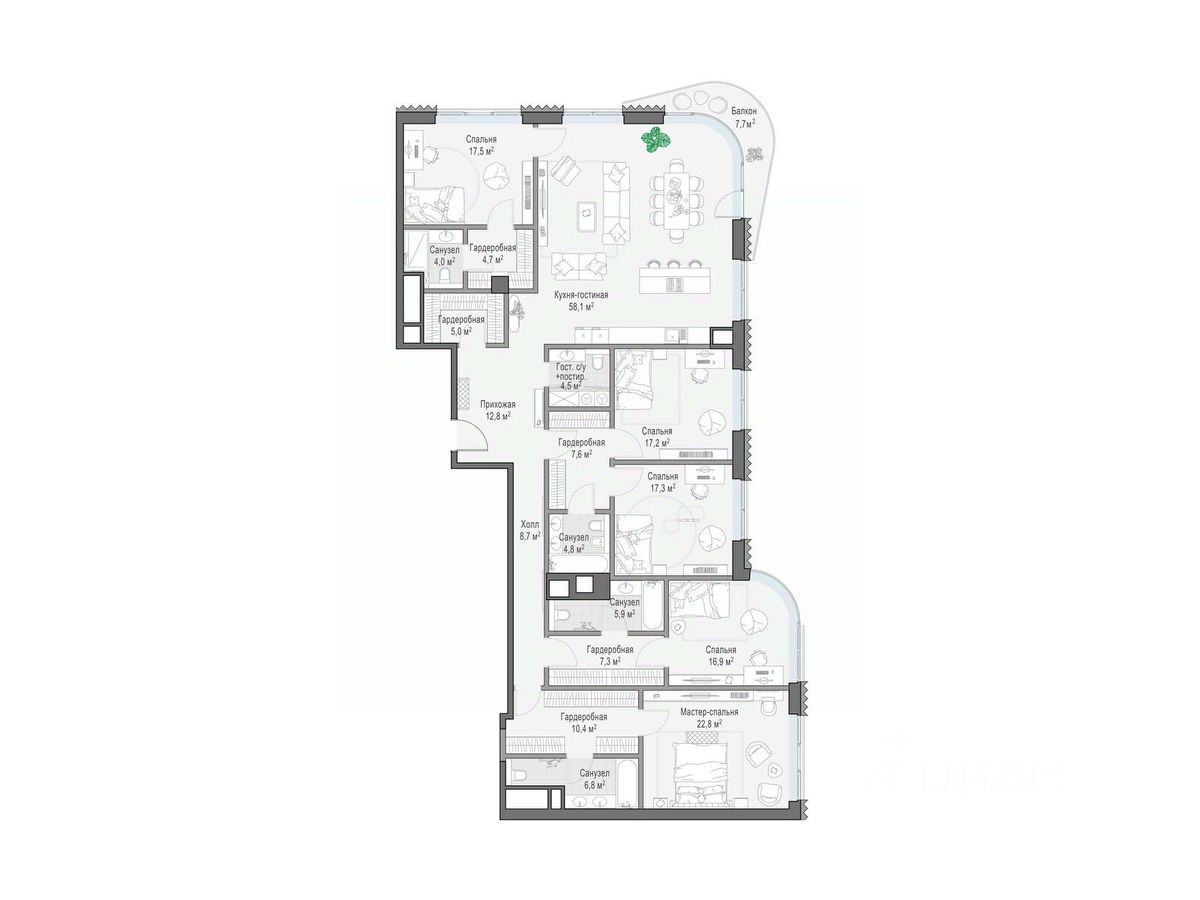 В проекте уникальный выбор квартир с просторными балконами, пентхаусов с террасами, бассейнами и каминами, максимальными видовыми характеристиками, а также роскошных вилл. Всего - 153 квартиры и 101 продуманное планировочное решение. Высота потолков составляет от 3,5 до 8,25 м. В доме предусмотрен 2х-уровневый паркинг на 279 машино-места.