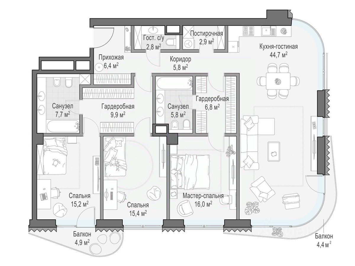 В проекте уникальный выбор квартир с просторными балконами, пентхаусов с террасами, бассейнами и каминами, максимальными видовыми характеристиками, а также роскошных вилл. Всего - 153 квартиры и 101 продуманное планировочное решение. Высота потолков составляет от 3,5 до 8,25 м. В доме предусмотрен 2х-уровневый паркинг на 279 машино-места.