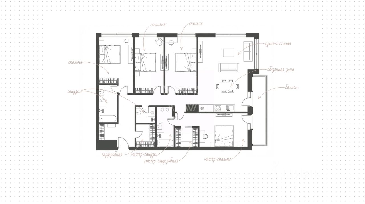 Квартира без отделки расположена на 9 этаже в корпусе Y. Возможная планировка: кухня-гостиная с выходом на террасу, мастер-спальня со своей гардеробной и санузлом, 3 спальни, три санузла, постирочная, гардеробная и холл.
