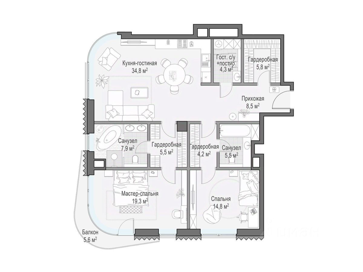 В проекте уникальный выбор квартир с просторными балконами, пентхаусов с террасами, бассейнами и каминами, максимальными видовыми характеристиками, а также роскошных вилл. Всего - 153 квартиры и 101 продуманное планировочное решение. Высота потолков составляет от 3,5 до 8,25 м. В доме предусмотрен 2х-уровневый паркинг на 279 машино-места.