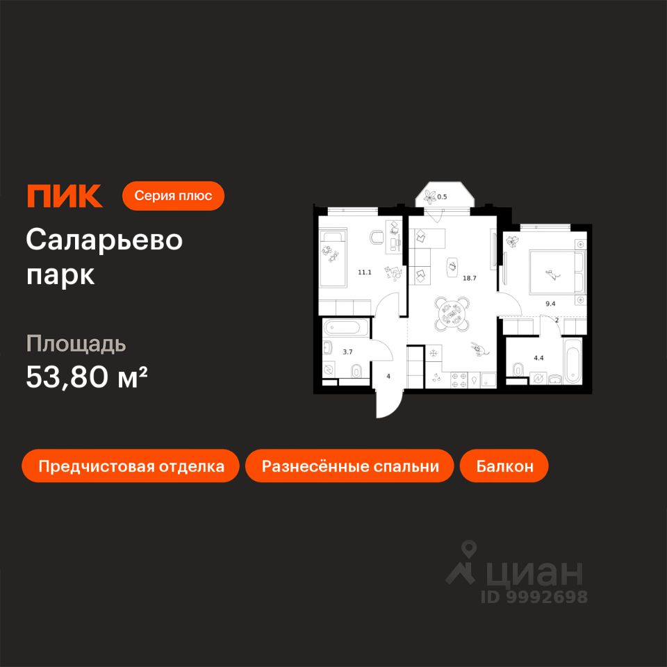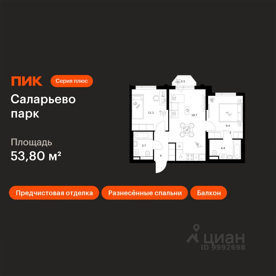Продаётся 2-комн. квартира площадью 53,8 кв.м на 9 этаже 24 этажного дома (Корпус 82.4, Секция 4) проекта ПИК Саларьево парк. Светлый просторный подъезд на уровне земли, функциональная планировка, большие окна, предчистовая отделка.