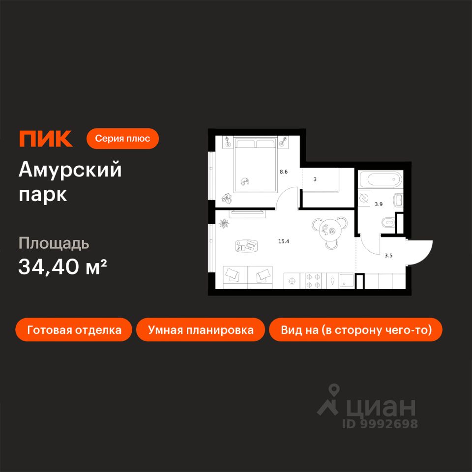 Продаётся 1-комн. квартира площадью 34,4 кв.м на 22 этаже 27 этажного дома (Корпус 4.5, Секция 6) проекта ПИК Амурский парк. Светлый просторный подъезд на уровне земли, функциональная планировка, большие окна, c отделкой.