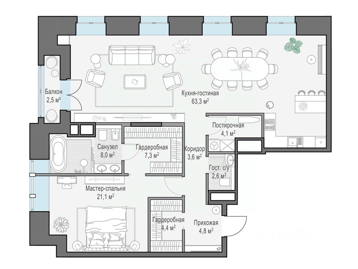 Просторная квартира с двумя приватными мастер-спальнями площадью 119,5 кв. м. В кухне-гостиной три больших арочных окна и балкон, которые наполняют её светом. Окно в ванной комнате дарит возможность зарядиться энергией первых лучей солнца. Роскошная планировка и высота потолка 3,9 метра позволяют создать пространство для любого сценария жизни.
