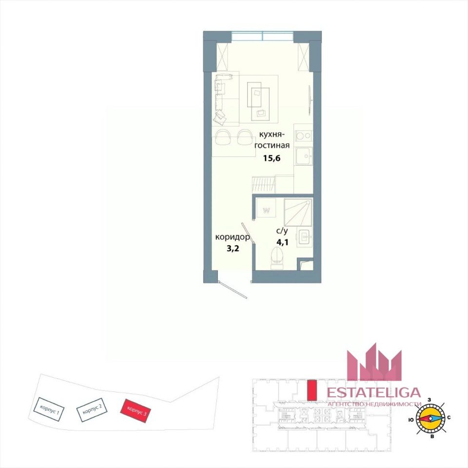Свободная планировка: просторная входная зона, кухня-гостиная и функциональный санузел. Чистая отделка — можно создать интерьер под себя.