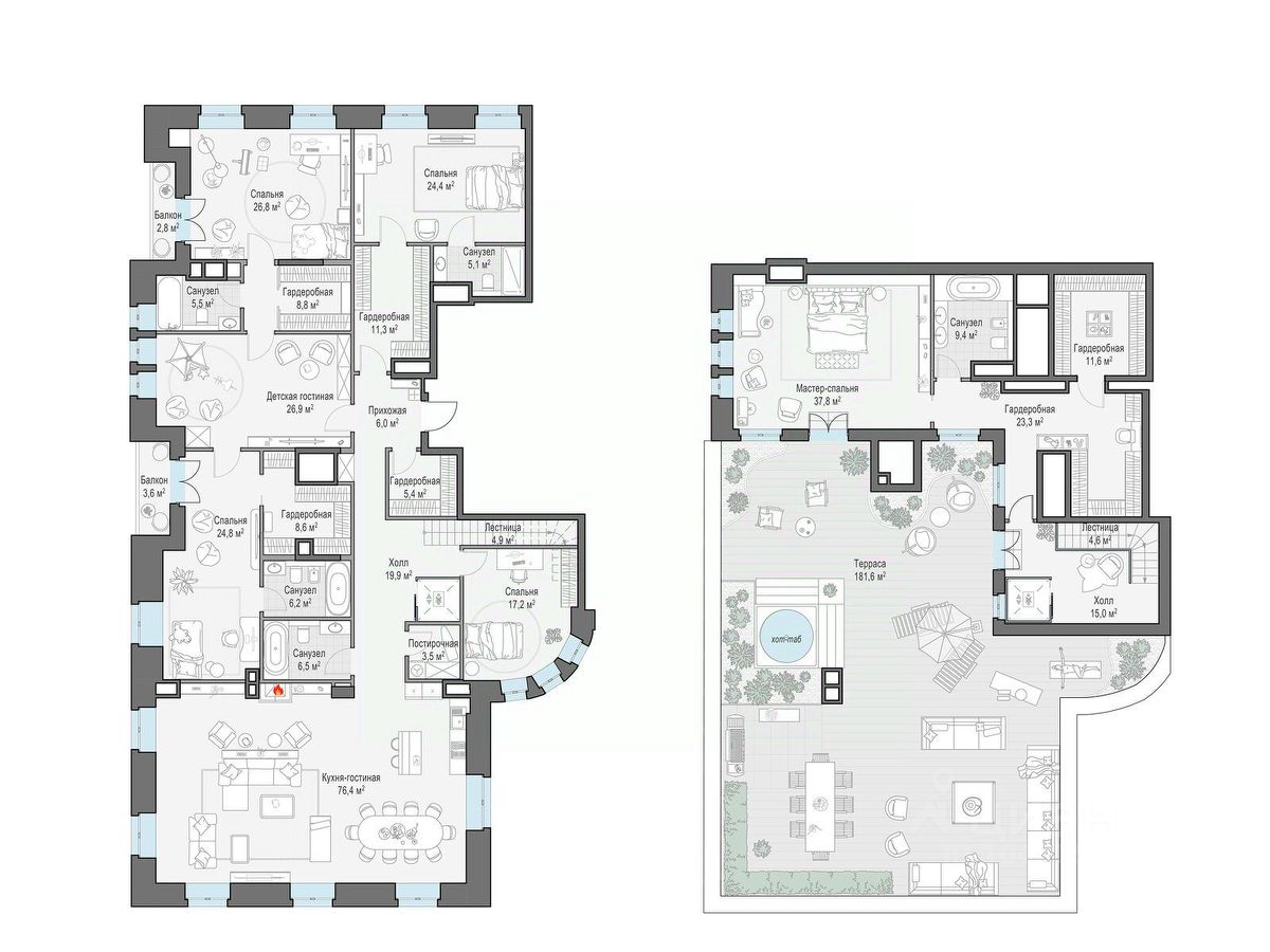 Роскошный пентхаус общей площадью 392,2 кв. м. расположен на 6-м этаже. Арочные окна, элегантный сферический эркер и высокие 4-метровые потолки создают уникальное пространство, наполненное светом. Продуманная и изысканная планировка, в которой разделены общие и приватные зоны позволит всем членам семьи совмещать свои сценарии жизни. Окна пентхауса выходят на все стороны света, дровяной камин в гостиной наполнит зимние вечера теплом и уютом, подчеркнет престиж и статус семьи. Потрескивание дров создает спокойную и романтичную атмосферу в доме. Расположенная на крыше личная терраса площадью 185 кв. м. с неповторимыми видами делает пентхаус идеальным местом для комфортной и по-настоящему роскошной жизни.